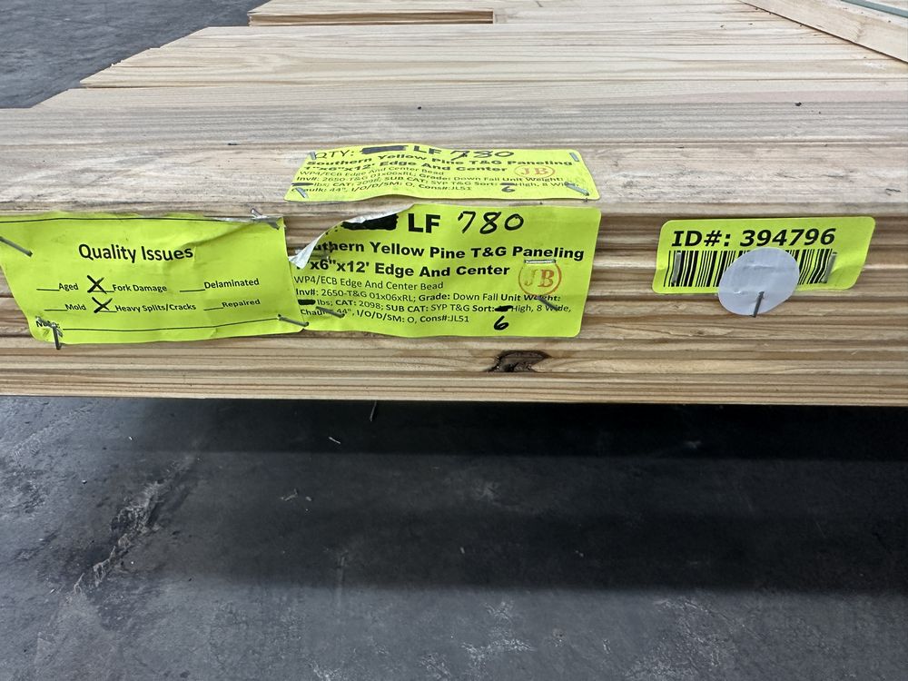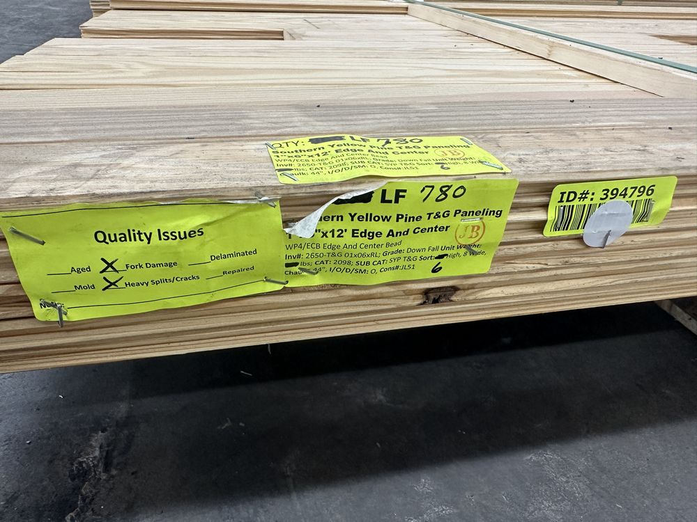 Southern Yellow Pine T&G Paneling 1"x6"x12' Edge and Center **SEE DESCRIPTION**. WP4/ECB Edge And Center Bead Grade: Down Fall **Fork Damage, Heavy Splits/Cracks, SEE PHOTOS**,This is a liquidated product. The Auction Company makes no express or implied representations or warranties of any kind regarding the Product. Any pre-existing retail, wholesale or manufacturer warranties will not transfer with the sale of this Product unless expressly stated otherwise on this page. The Buyer accepts the Product in as-is condition, with all faults. Weight: x. Sold by: Linear Foot. Sold as: Quantity X Price. Inventory #: 2650-T&G 01x06xRL