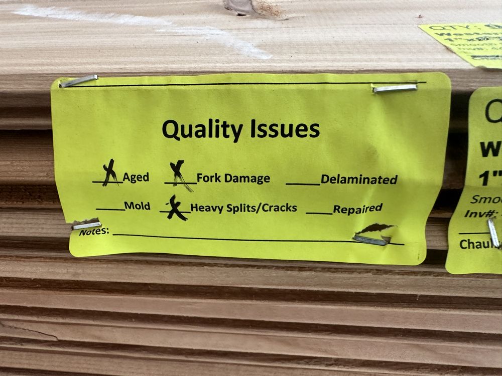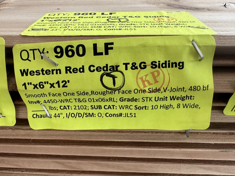 Western Red Cedar T&G Siding 1"x6"x12' **SEE DESCRIPTION**. Smooth Face One Side, Rougher Face One Side, V-Joint, 480 Borad Foot Grade: STK **Fork Damage, Heavy Splits/Cracks, Aged**,This is a liquidated product. The Auction Company makes no express or implied representations or warranties of any kind regarding the Product. Any pre-existing retail, wholesale or manufacturer warranties will not transfer with the sale of this Product unless expressly stated otherwise on this page. The Buyer accepts the Product in as-is condition, with all faults. Weight: . Sold by: Board. Sold as: Quantity X Price. Inventory #: 4450-WRC T&G 01x06xRL