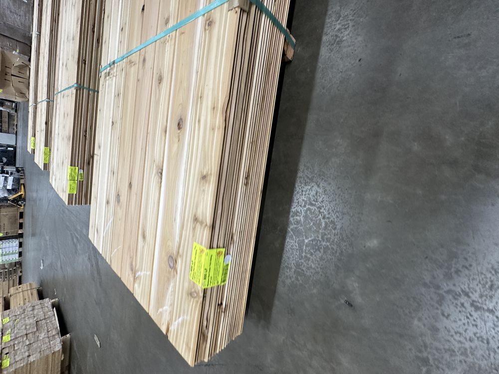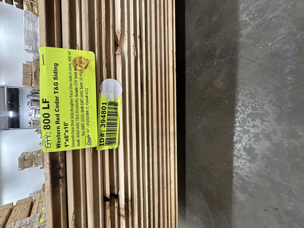 Western Red Cedar T&G Siding 1"x6"x10'. Smooth Face One Side, Rougher Face One Side, V Joint, 400 board foot, 80 pieces, Grade: STK,This is a liquidated product. The Auction Company makes no express or implied representations or warranties of any kind regarding the Product. Any pre-existing retail, wholesale or manufacturer warranties will not transfer with the sale of this Product unless expressly stated otherwise on this page. The Buyer accepts the Product in as-is condition, with all faults. Weight: 480. Sold by: Linear Foot. Sold as: Quantity X Price. Inventory #: 4450-WRC T&G 01x06xRL
