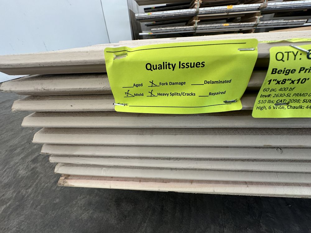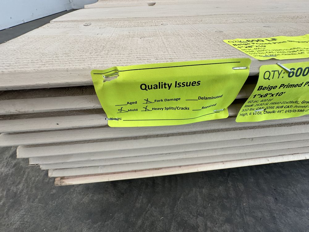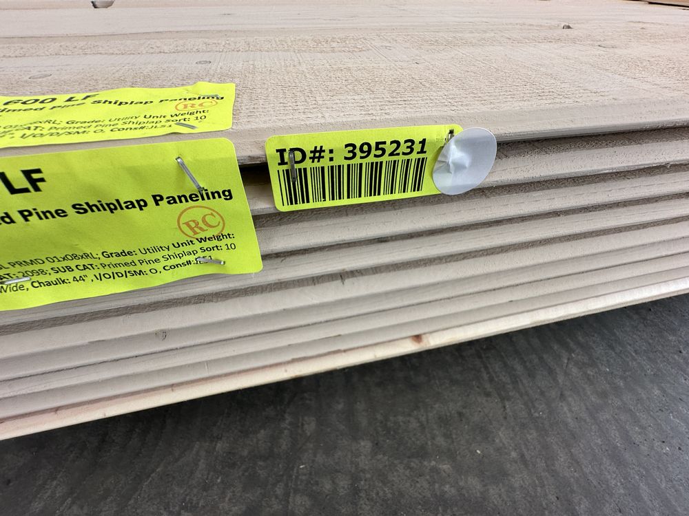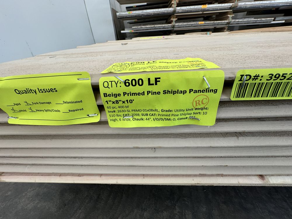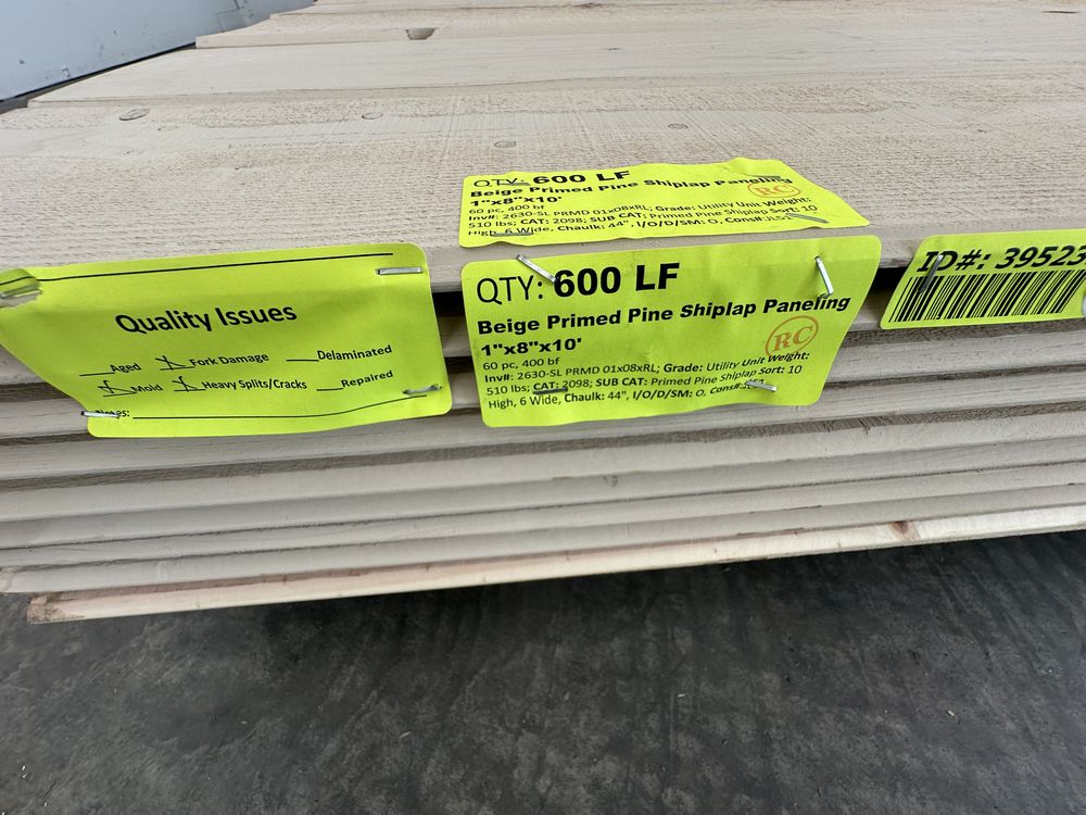 Beige Primed Pine Shiplap Paneling 1"x8"x10' **SEE DESCRIPTION**. 60 Pieces, 400 Board Foot, Grade: Utility **Fork Damage, Heavy Splits/Cracks, Mold, SEE PHOTOS**,This is a liquidated product. The Auction Company makes no express or implied representations or warranties of any kind regarding the Product. Any pre-existing retail, wholesale or manufacturer warranties will not transfer with the sale of this Product unless expressly stated otherwise on this page. The Buyer accepts the Product in as-is condition, with all faults. Weight: 510. Sold by: Linear Foot. Sold as: Quantity X Price. Inventory #: 2630-SL PRMD 01x08xRL