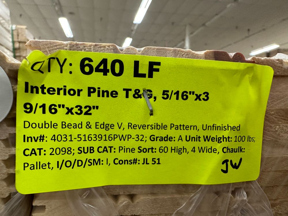 Interior Pine T&G, 5/16"x3 9/16"x32". Double Bead & Edge V, Reversible Pattern, Unfinished, Grade:A,This is a liquidated product. The Auction Company makes no express or implied representations or warranties of any kind regarding the Product. Any pre-existing retail, wholesale or manufacturer warranties will not transfer with the sale of this Product unless expressly stated otherwise on this page. The Buyer accepts the Product in as-is condition, with all faults. Weight: 100. Sold by: Linear Foot. Sold as: Quantity X Price. Inventory #: 4031-5163916PWP-32
