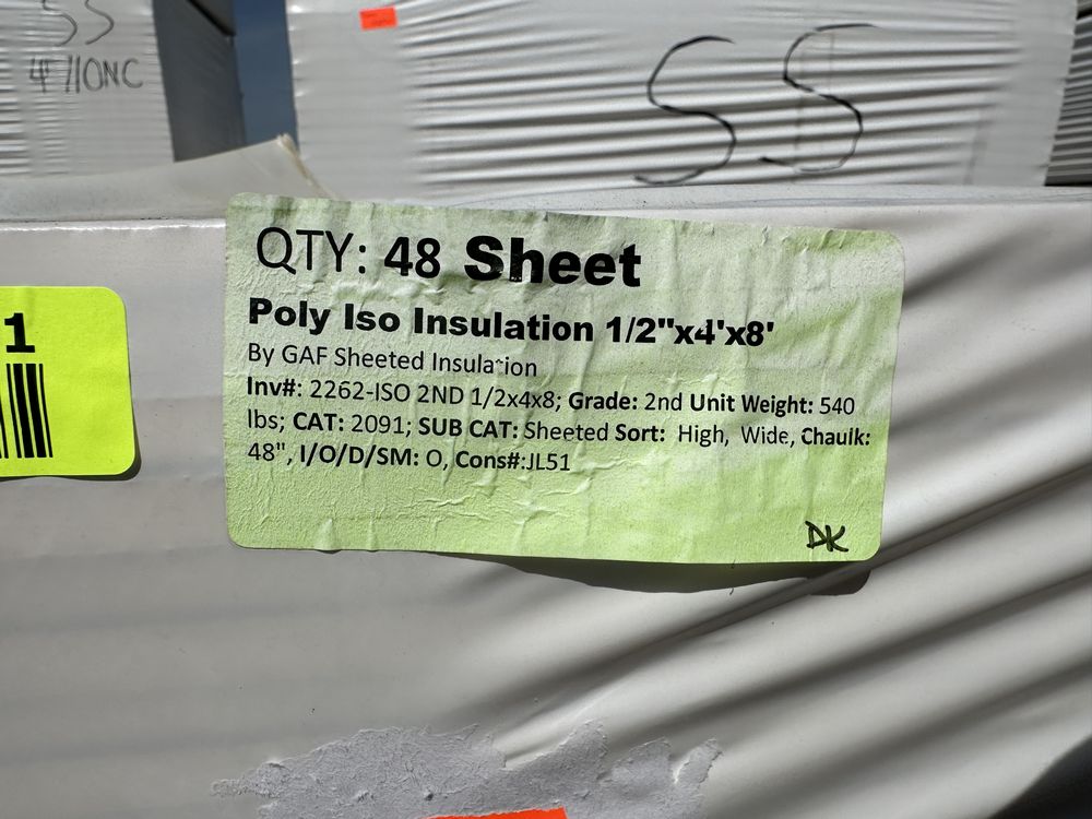 Poly Iso Insulation 1/2"x4'x8'. Sheeted Insulation Grade: B,This is a liquidated product. The Auction Company makes no express or implied representations or warranties of any kind regarding the Product. Any pre-existing retail, wholesale or manufacturer warranties will not transfer with the sale of this Product unless expressly stated otherwise on this page. The Buyer accepts the Product in as-is condition, with all faults. Weight: x. Sold by: Sheet. Sold as: Quantity X Price. Inventory #: 2262-ISO 2ND 1/2x4x8