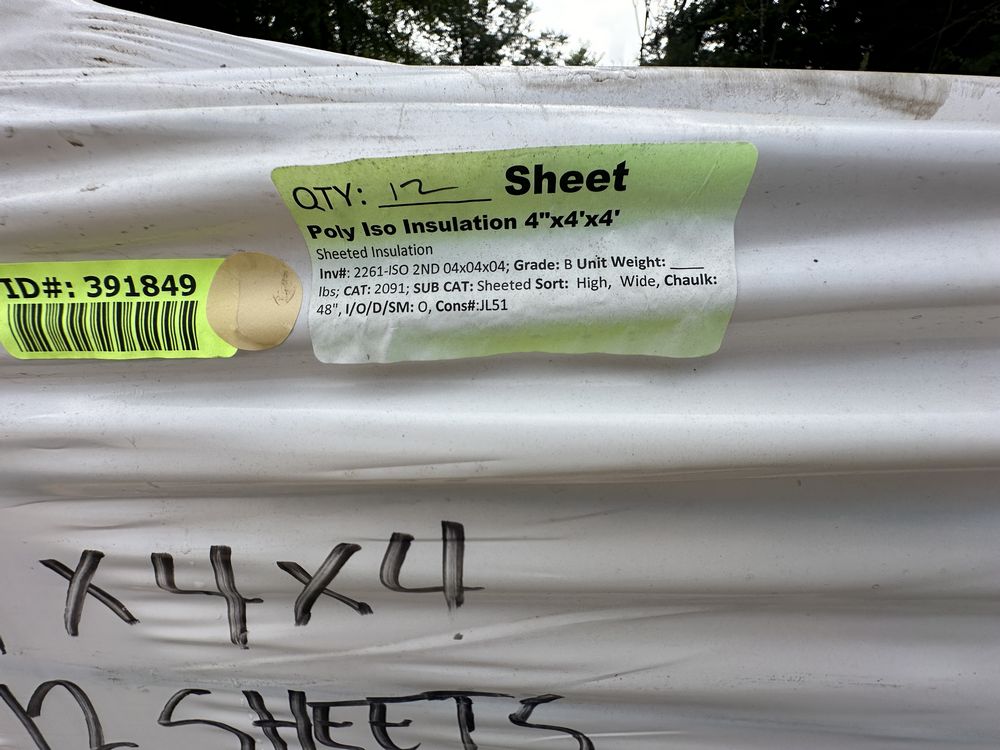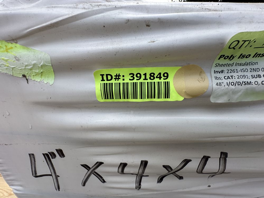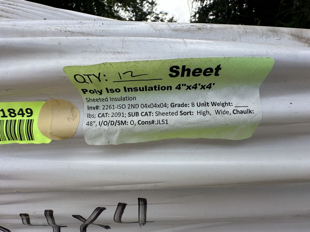Poly Iso Insulation 4"x4'x4'. Sheeted Insulation, Grade: B,This is a liquidated product. The Auction Company makes no express or implied representations or warranties of any kind regarding the Product. Any pre-existing retail, wholesale or manufacturer warranties will not transfer with the sale of this Product unless expressly stated otherwise on this page. The Buyer accepts the Product in as-is condition, with all faults. Weight: x. Sold by: Sheet. Sold as: Quantity X Price. Inventory #: 2261-ISO 2ND 04x04x04