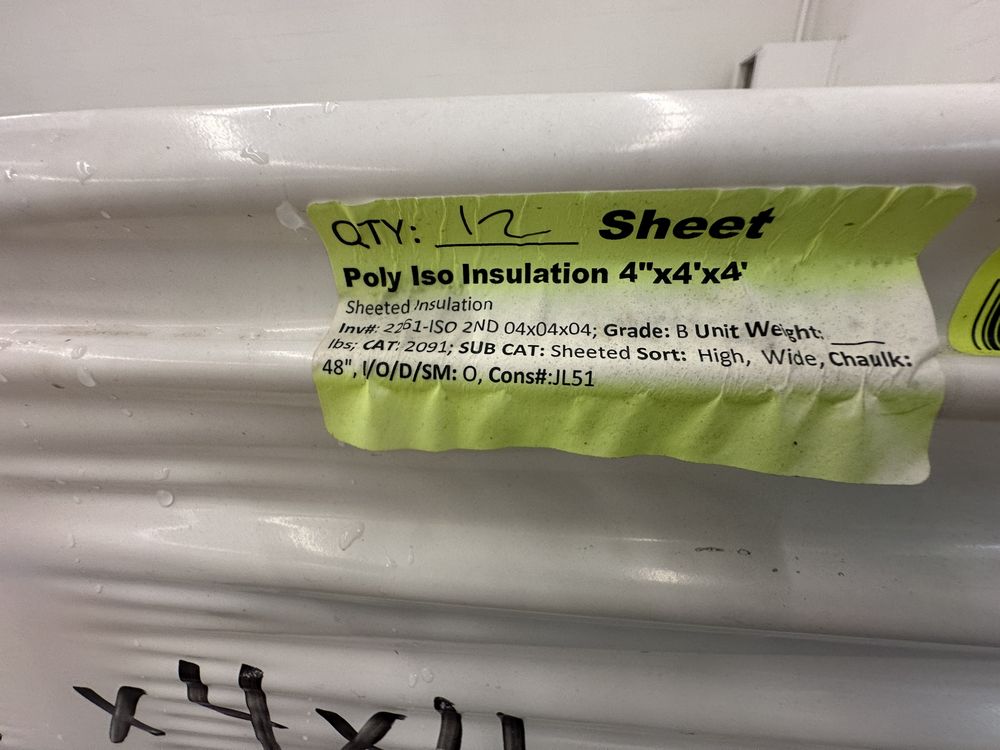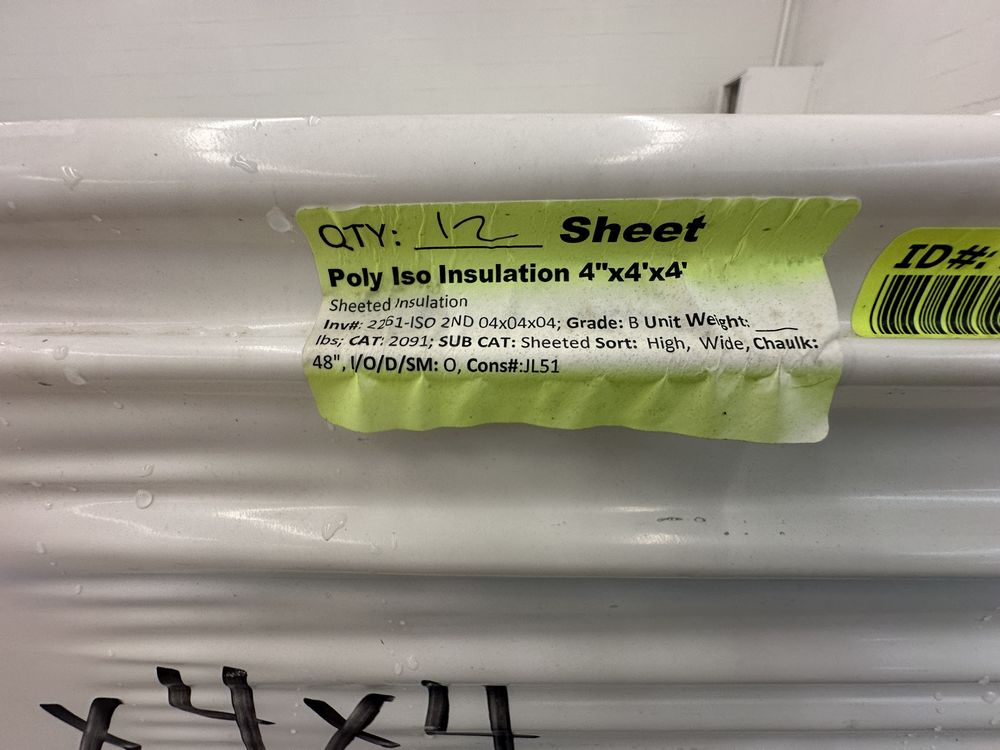 Poly Iso Insulation 4"x4'x4'. Sheeted Insulation, Grade:B,This is a liquidated product. The Auction Company makes no express or implied representations or warranties of any kind regarding the Product. Any pre-existing retail, wholesale or manufacturer warranties will not transfer with the sale of this Product unless expressly stated otherwise on this page. The Buyer accepts the Product in as-is condition, with all faults. Weight: x. Sold by: Sheet. Sold as: Quantity X Price. Inventory #: 2261-ISO 2ND 04x04x04