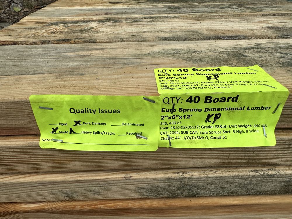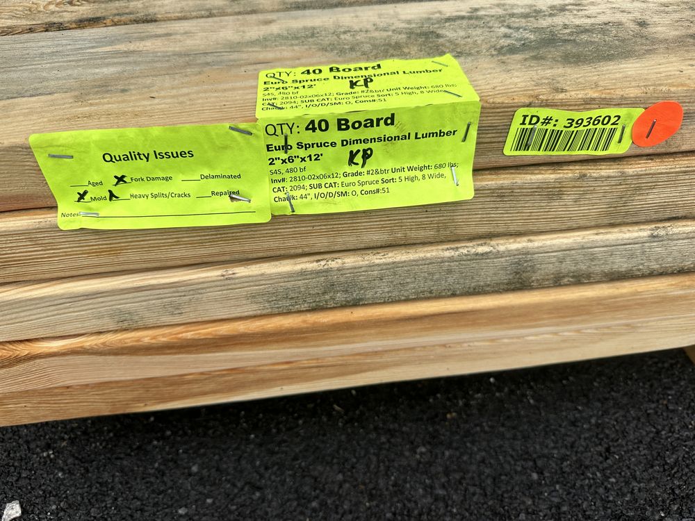 Euro Spruce Dimensional Lumber 2"x6"x12' **SEE DESCRIPTION**. S4S, 480 Board Foot Grade: #2&btr **Fork Damage, Heavy Splits/Cracks, Mold**,This is a liquidated product. The Auction Company makes no express or implied representations or warranties of any kind regarding the Product. Any pre-existing retail, wholesale or manufacturer warranties will not transfer with the sale of this Product unless expressly stated otherwise on this page. The Buyer accepts the Product in as-is condition, with all faults. Weight: 680. Sold by: Board. Sold as: Quantity X Price. Inventory #: 2810-02x06x12