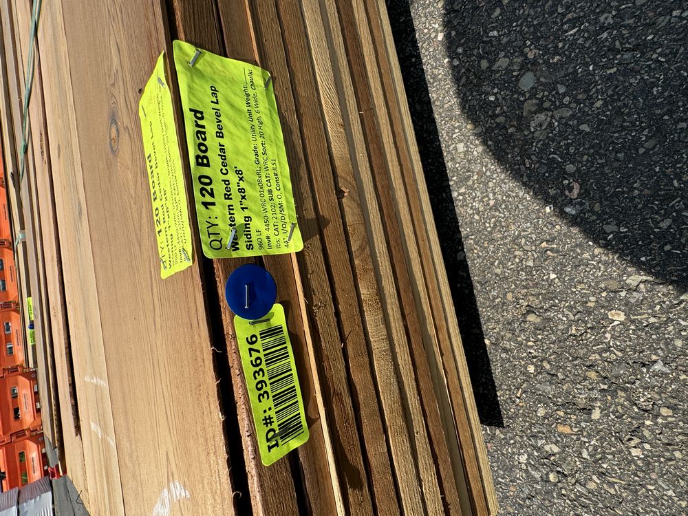 Western Red Cedar Bevel Lap Siding 1"x8"x8'. 960 Linear Foot Grade: Utility,This is a liquidated product. The Auction Company makes no express or implied representations or warranties of any kind regarding the Product. Any pre-existing retail, wholesale or manufacturer warranties will not transfer with the sale of this Product unless expressly stated otherwise on this page. The Buyer accepts the Product in as-is condition, with all faults. Weight: x. Sold by: Board. Sold as: Quantity X Price. Inventory #: 4450-WRC 01x08xRL