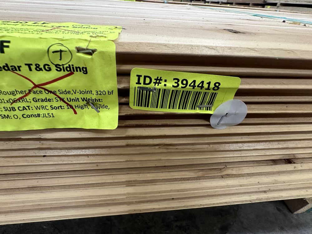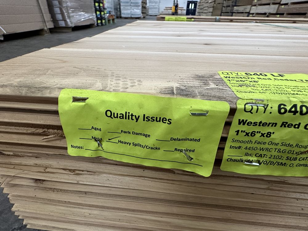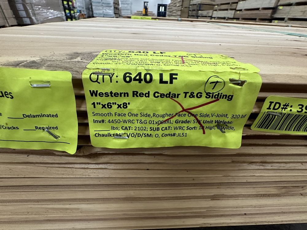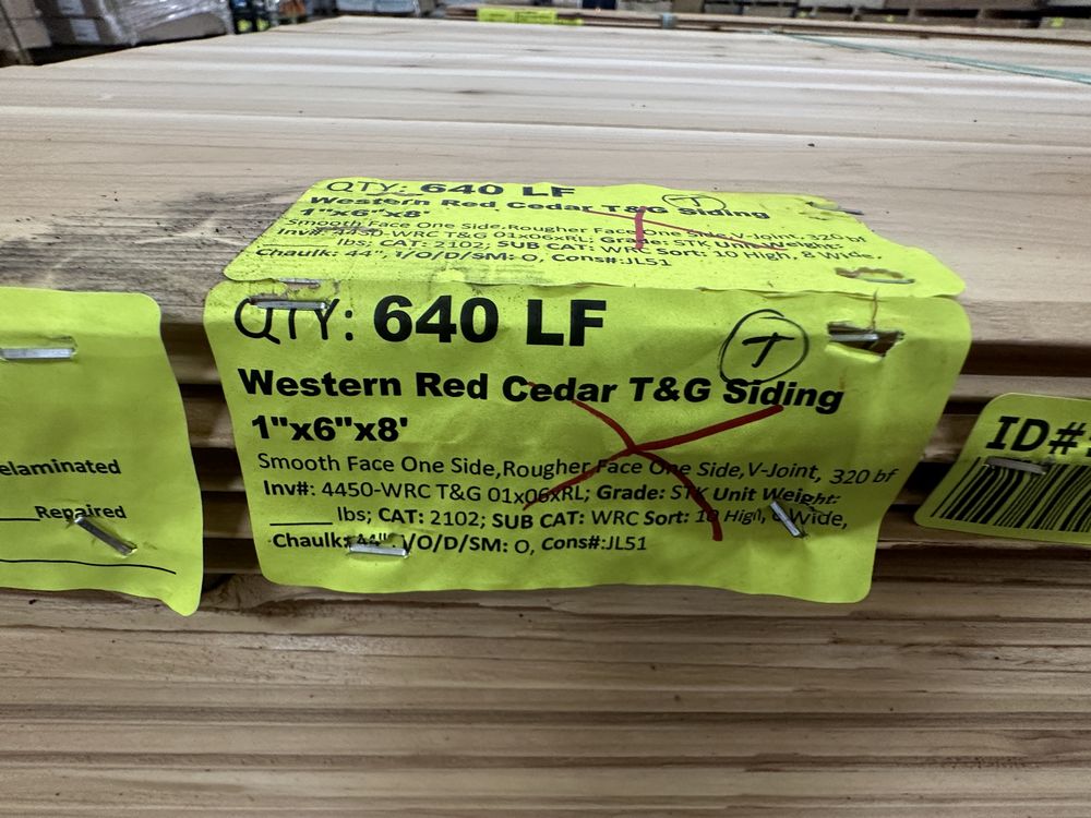 Western Red Cedar T&G Siding 1"x6"x8' ** SEE DESCRIPTION**. Smooth Face One Side, Rougher Face One Side, V-Joint, 32 Board Foot, Grade:STK ** Heavy Splits/Cracks, SEE PHOTOS**,This is a liquidated product. The Auction Company makes no express or implied representations or warranties of any kind regarding the Product. Any pre-existing retail, wholesale or manufacturer warranties will not transfer with the sale of this Product unless expressly stated otherwise on this page. The Buyer accepts the Product in as-is condition, with all faults. Weight: x. Sold by: Linear Foot. Sold as: Quantity X Price. Inventory #: 4450-WRC T&G 01x06xRL