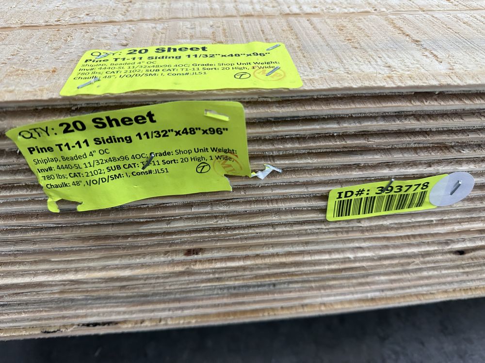 Pine T1-11 Siding 11/32"x48"x96". Shiplap, Beaded 4" On Center, Grade: Shop,This is a liquidated product. The Auction Company makes no express or implied representations or warranties of any kind regarding the Product. Any pre-existing retail, wholesale or manufacturer warranties will not transfer with the sale of this Product unless expressly stated otherwise on this page. The Buyer accepts the Product in as-is condition, with all faults. Weight: 780. Sold by: Sheet. Sold as: Quantity X Price. Inventory #: 4440-SL 11/32x48x96 4OC
