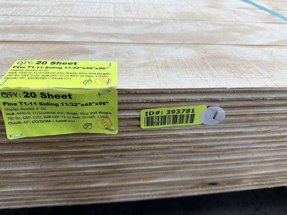 Pine T1-11 Siding 11/32"x48"x96". Shiplap, Beaded 4" On Center, Grade: Shop,This is a liquidated product. The Auction Company makes no express or implied representations or warranties of any kind regarding the Product. Any pre-existing retail, wholesale or manufacturer warranties will not transfer with the sale of this Product unless expressly stated otherwise on this page. The Buyer accepts the Product in as-is condition, with all faults. Weight: 780. Sold by: Sheet. Sold as: Quantity X Price. Inventory #: 4440-SL 11/32x48x96 4OC