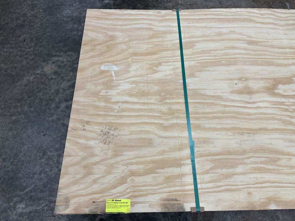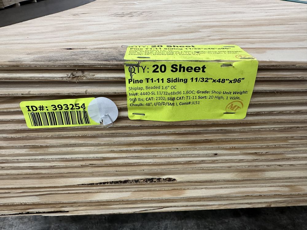 Pine T1-11 Siding 11/32"x48"x96". Shiplap, Beaded 1.6" OC Grade: Shop,This is a liquidated product. The Auction Company makes no express or implied representations or warranties of any kind regarding the Product. Any pre-existing retail, wholesale or manufacturer warranties will not transfer with the sale of this Product unless expressly stated otherwise on this page. The Buyer accepts the Product in as-is condition, with all faults. Weight: 960. Sold by: Sheet. Sold as: Quantity X Price. Inventory #: 4440-SL 11/32x48x96