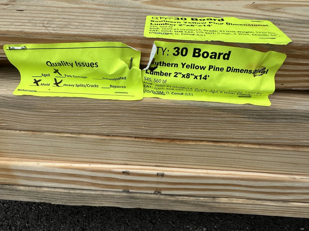 Southern Yellow Pine Dimensional Lumber 2"x8"x14' **SEE DESCRIPTION**. S4S, 560 Board Foot Grade: #3 **Fork Damage, Heavy Splits/Cracks, Mold, SEE PHOTOS**,This is a liquidated product. The Auction Company makes no express or implied representations or warranties of any kind regarding the Product. Any pre-existing retail, wholesale or manufacturer warranties will not transfer with the sale of this Product unless expressly stated otherwise on this page. The Buyer accepts the Product in as-is condition, with all faults. Weight: 1320. Sold by: Board. Sold as: Quantity X Price. Inventory #: 2650-#3 02x8x14