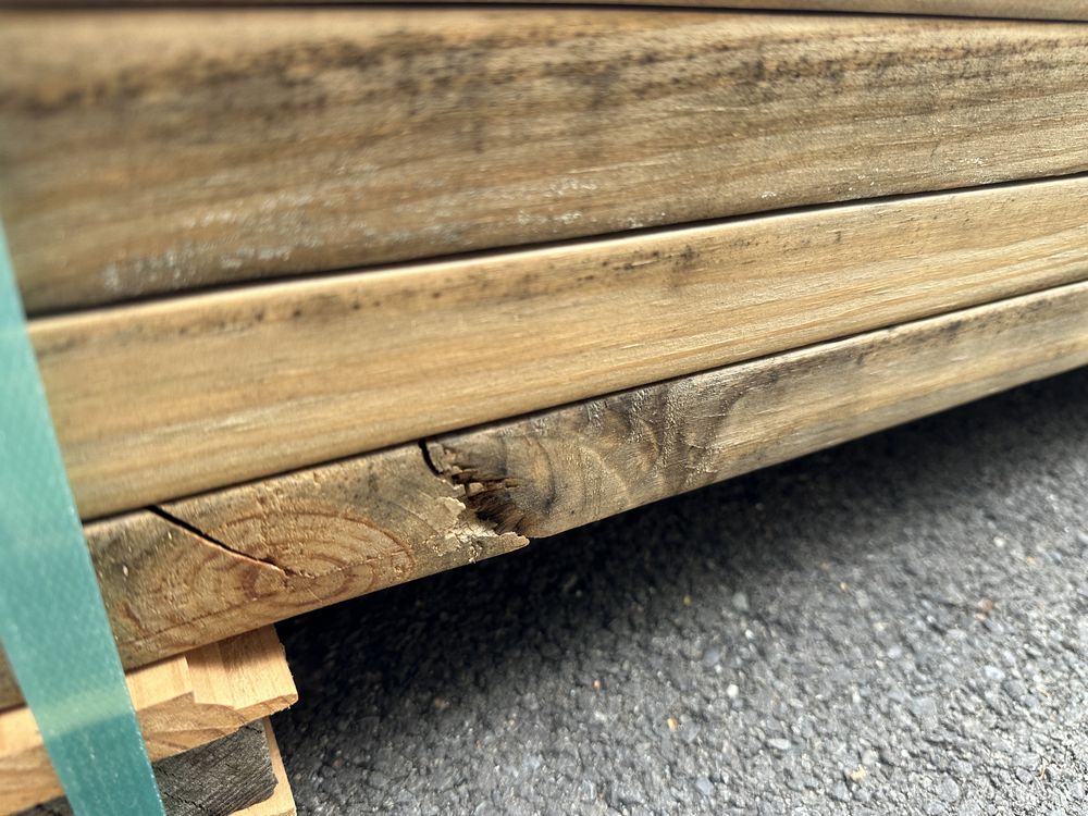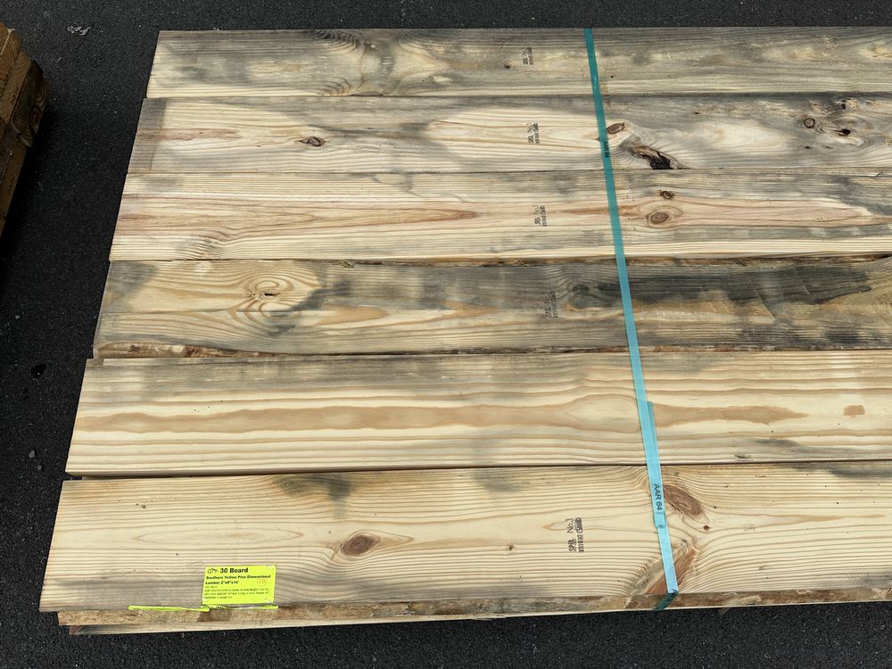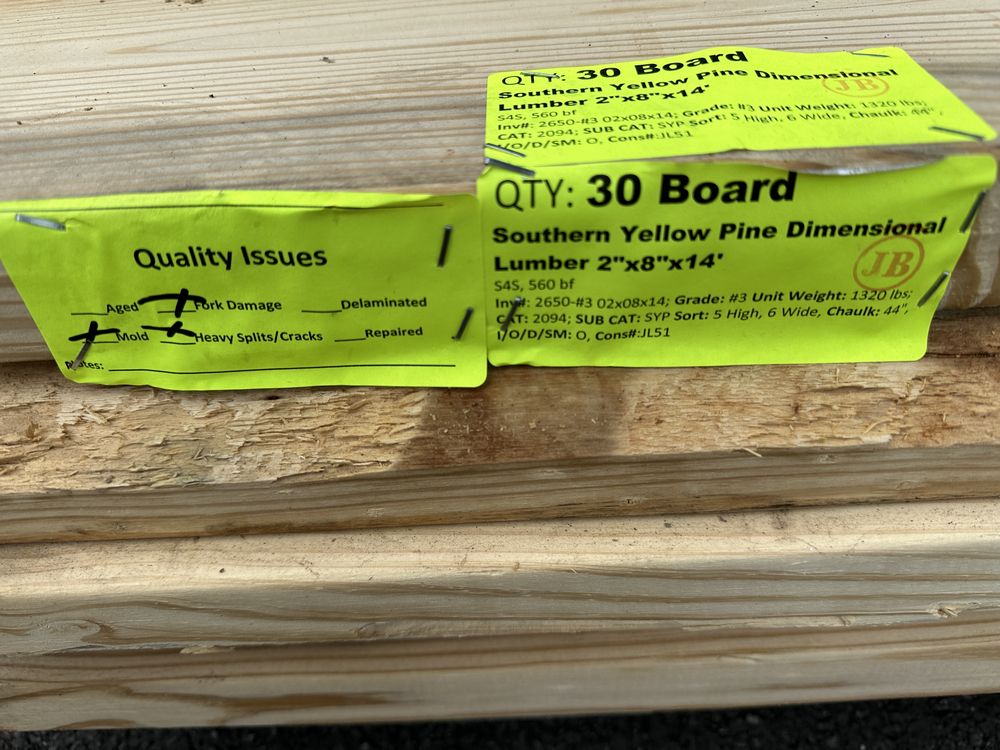 Southern Yellow Pine Dimensional Lumber 2"x8"x14' **SEE DESCRIPTION**. S4S, 560 Board Foot Grade: #3 **Fork Damage, Heavy Splits/Cracks, Mold, SEE PHOTOS**,This is a liquidated product. The Auction Company makes no express or implied representations or warranties of any kind regarding the Product. Any pre-existing retail, wholesale or manufacturer warranties will not transfer with the sale of this Product unless expressly stated otherwise on this page. The Buyer accepts the Product in as-is condition, with all faults. Weight: 1320. Sold by: Board. Sold as: Quantity X Price. Inventory #: 2650-#3 02x8x14