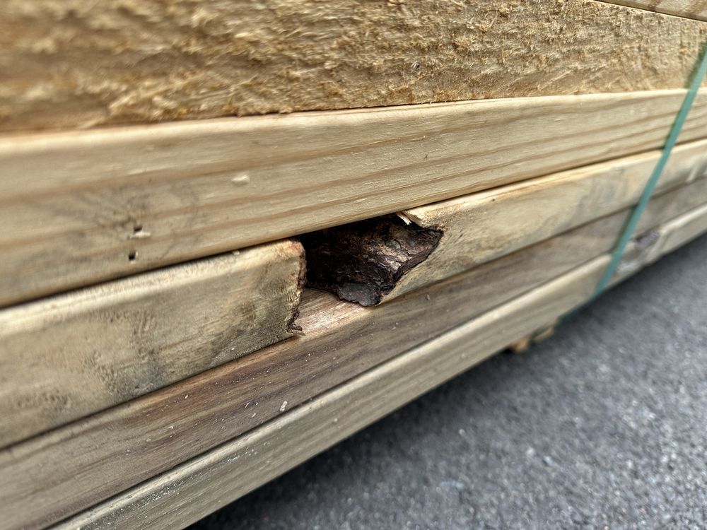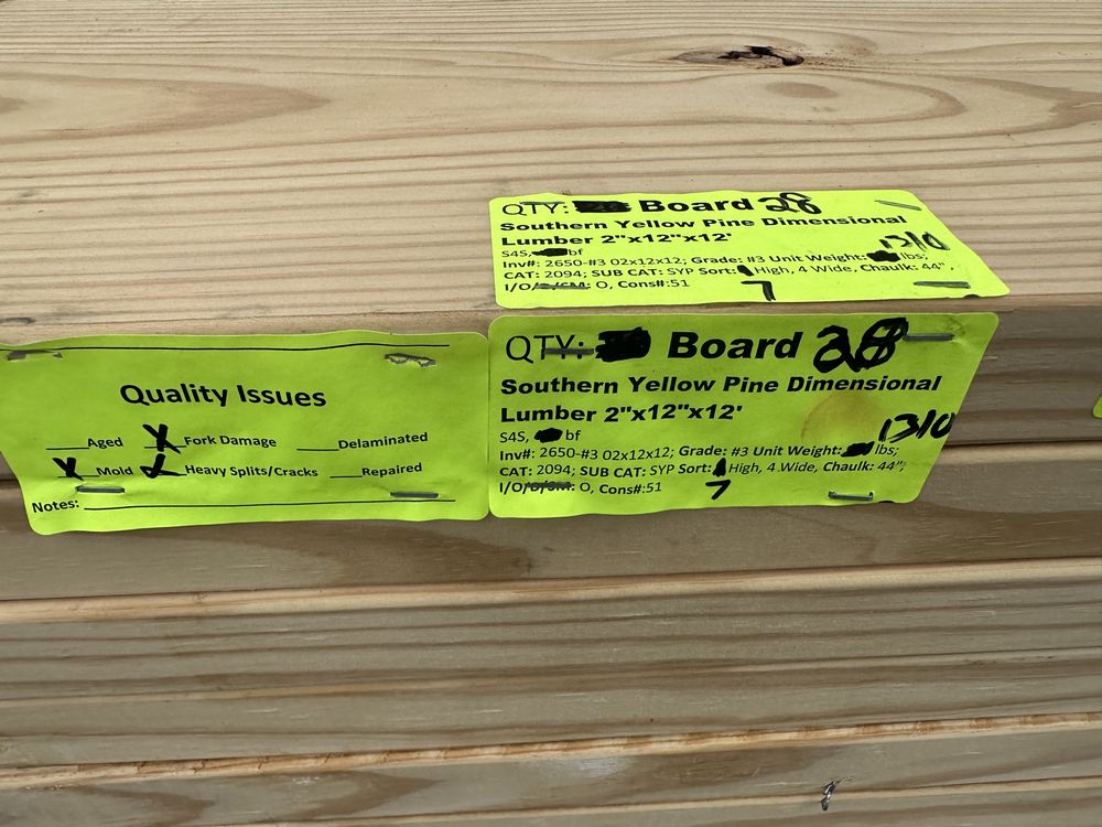 Southern Yellow Pine Dimensional Lumber 2"x12"x12' **SEE DESCRIPTION**. S4S, Grade: #4 **Fork Damage, Heavy Splits/Cracks, Mold, SEE PHOTOS**,This is a liquidated product. The Auction Company makes no express or implied representations or warranties of any kind regarding the Product. Any pre-existing retail, wholesale or manufacturer warranties will not transfer with the sale of this Product unless expressly stated otherwise on this page. The Buyer accepts the Product in as-is condition, with all faults. Weight: 970. Sold by: Board. Sold as: Quantity X Price. Inventory #: 2650-#3 02x12x12