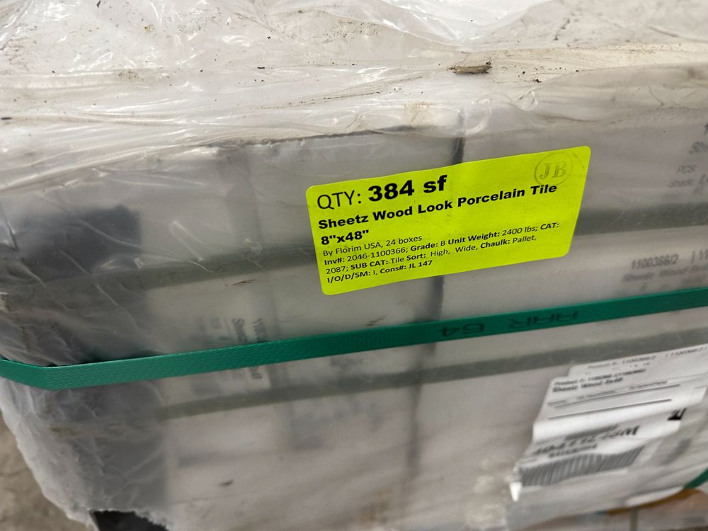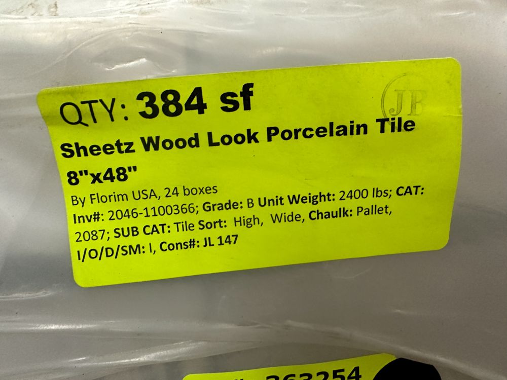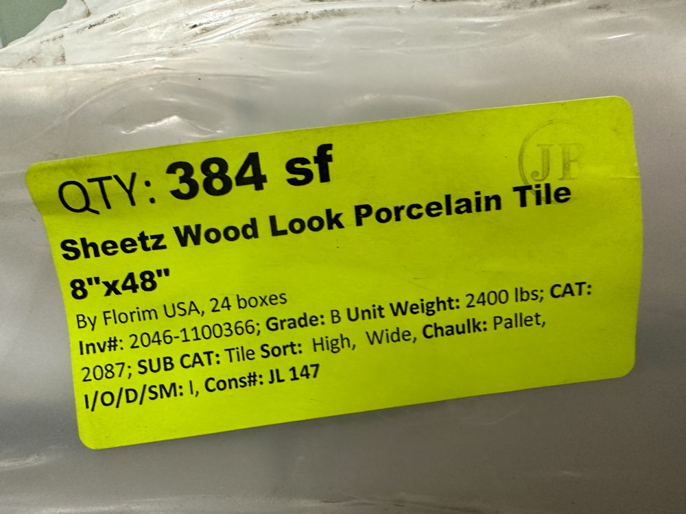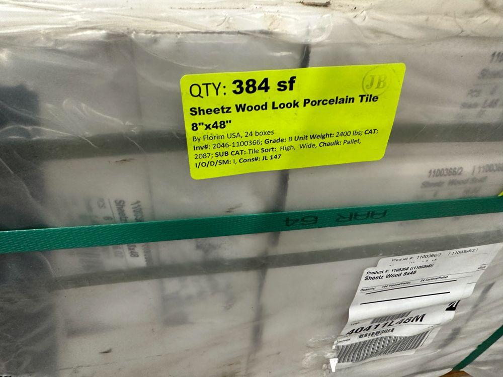 Sheetz Wood Look Porcelain Tile 8"x48". By Florim USA, 24 Boxes, Grade: B,This is a liquidated product. The Auction Company makes no express or implied representations or warranties of any kind regarding the Product. Any pre-existing retail, wholesale or manufacturer warranties will not transfer with the sale of this Product unless expressly stated otherwise on this page. The Buyer accepts the Product in as-is condition, with all faults. Weight: 2400. Sold by: Square Foot. Sold as: Quantity X Price. Inventory #: 2046-1100366