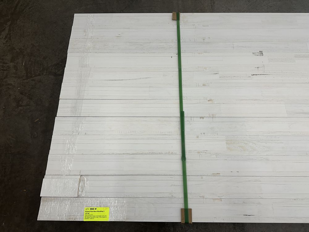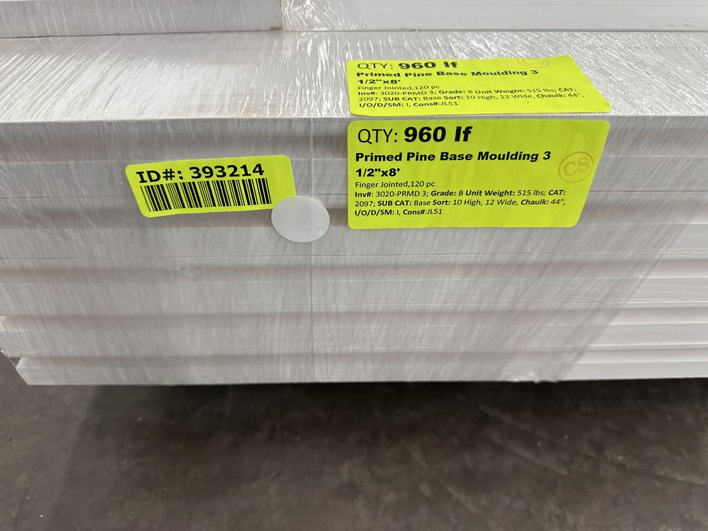 Primed Pine Base Moulding 3 1/2"x8'. Finger Jointed, 120 Pieces, Grade: B,This is a liquidated product. The Auction Company makes no express or implied representations or warranties of any kind regarding the Product. Any pre-existing retail, wholesale or manufacturer warranties will not transfer with the sale of this Product unless expressly stated otherwise on this page. The Buyer accepts the Product in as-is condition, with all faults. Weight: 515. Sold by: Linear Foot. Sold as: Quantity X Price. Inventory #: 3020-PRMD 3