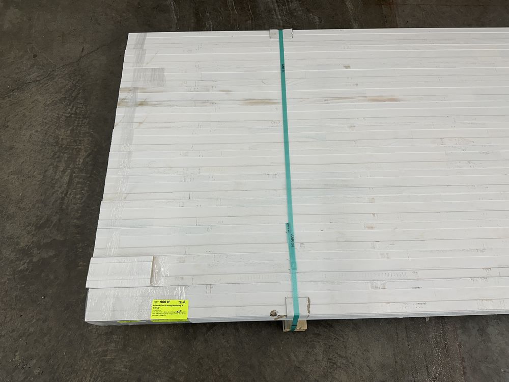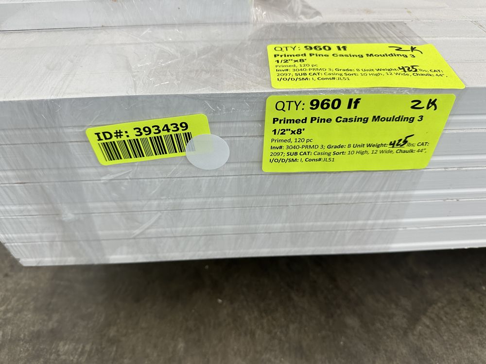 Primed Pine Casing Moulding 3 1/2"x8' *See Description*. Primed 120 Pieces, Grade: B *Minor Fork Damage to top piece, see photos*,This is a liquidated product. The Auction Company makes no express or implied representations or warranties of any kind regarding the Product. Any pre-existing retail, wholesale or manufacturer warranties will not transfer with the sale of this Product unless expressly stated otherwise on this page. The Buyer accepts the Product in as-is condition, with all faults. Weight: 425. Sold by: Linear Foot. Sold as: Quantity X Price. Inventory #: 3040-PRMD 3