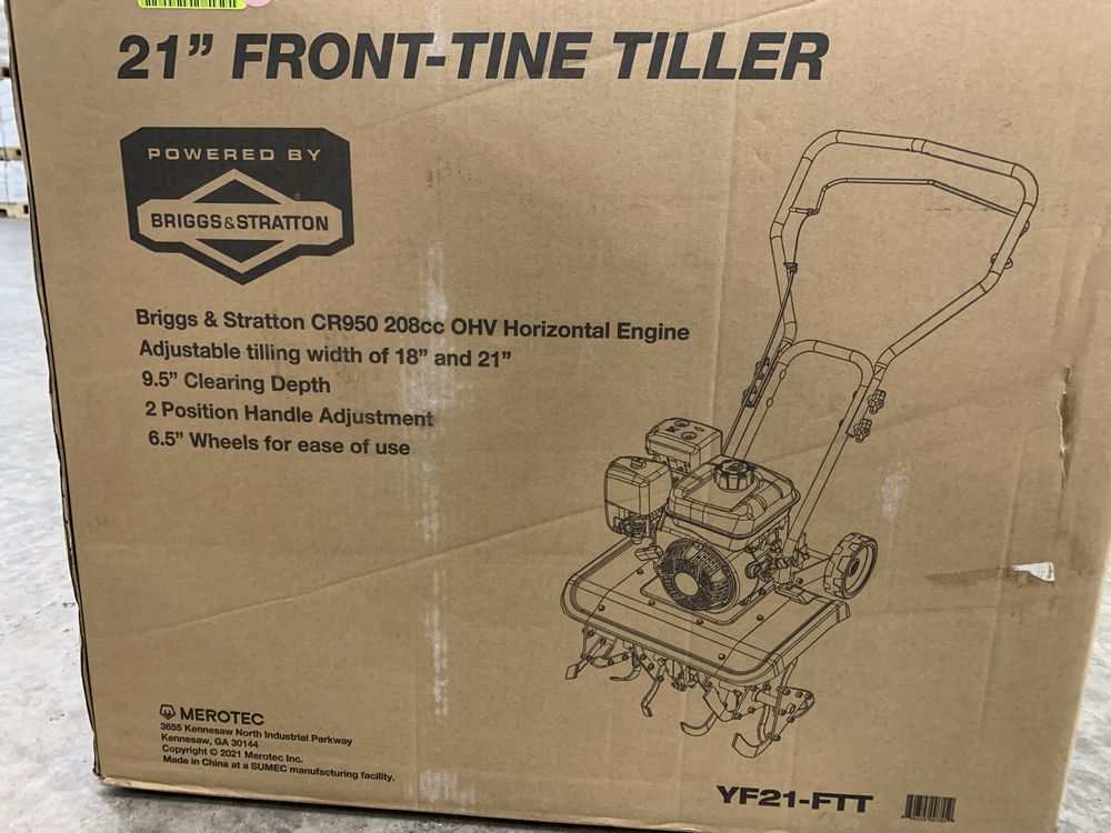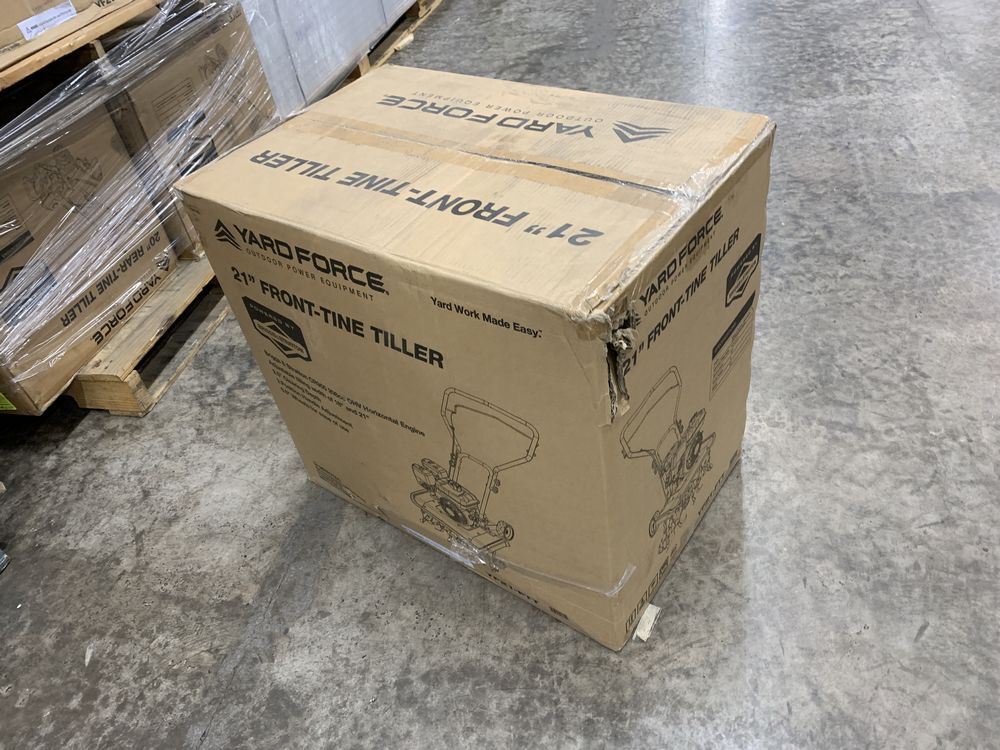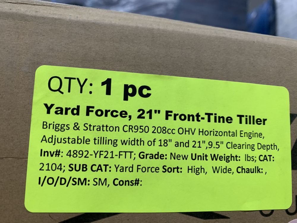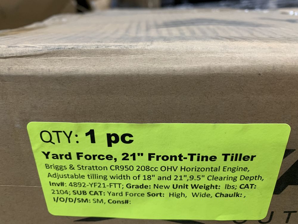 Yard Force, 21" Front-Tine Tiller. Briggs & Stratton CR950 208cc OHV Horizontal Engine, Adjustable Tilling Width of 18" and 21", 9.5" Clearing Depth, Grade: New,This is a liquidated product. Any pre-existing retail, wholesale or manufacturer warranties will not transfer with the sale of this Product unless expressly stated otherwise. Weight: X. Sold by: Piece. Sold as: Quantity X Price. Inventory #: 4892-YF21-FTT