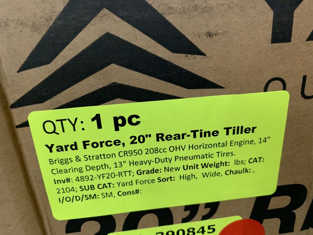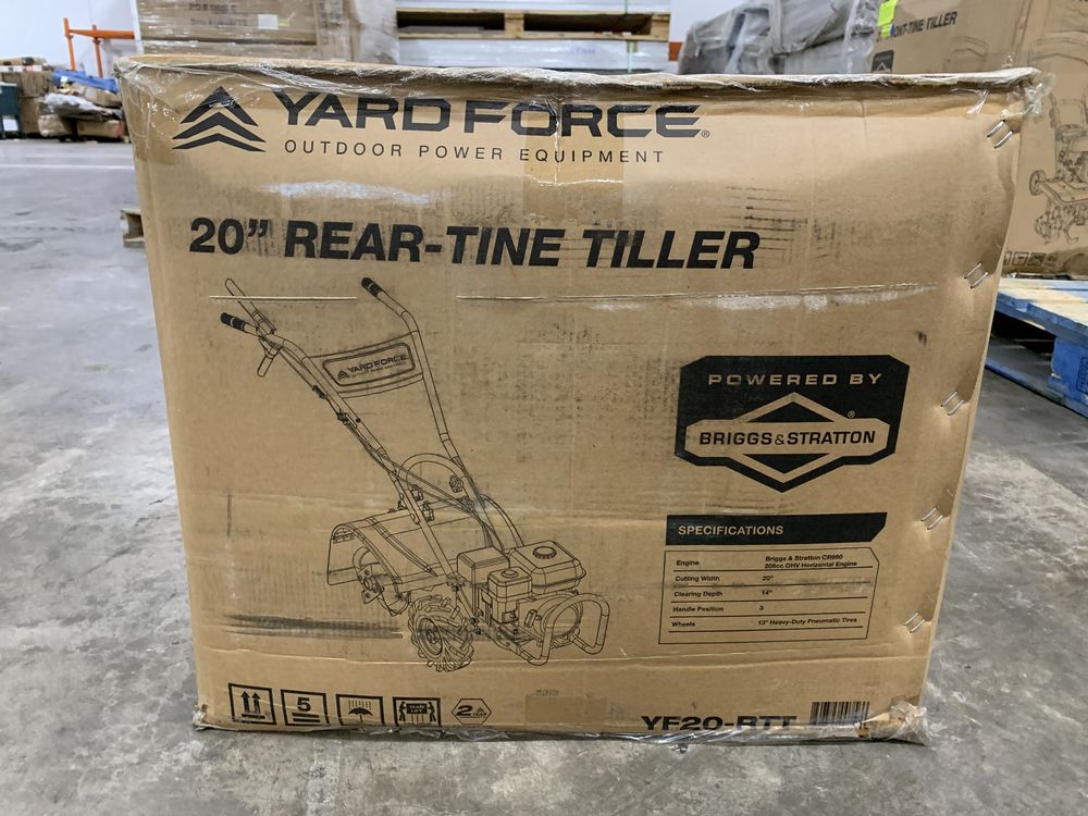 Yard Force, 20" Rear-Tine Tiller. Briggs & Stratton CR950 208cc OHV Horizontal Engine, 14" Clearing Depth, 13" Heavy Duty Pneumatic Tires. Grade: New,This is a liquidated product. Any pre-existing retail, wholesale or manufacturer warranties will not transfer with the sale of this Product unless expressly stated otherwise. Weight: x. Sold by: Piece. Sold as: Quantity X Price. Inventory #: 4892-YF20-RTT
