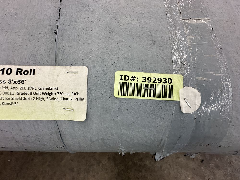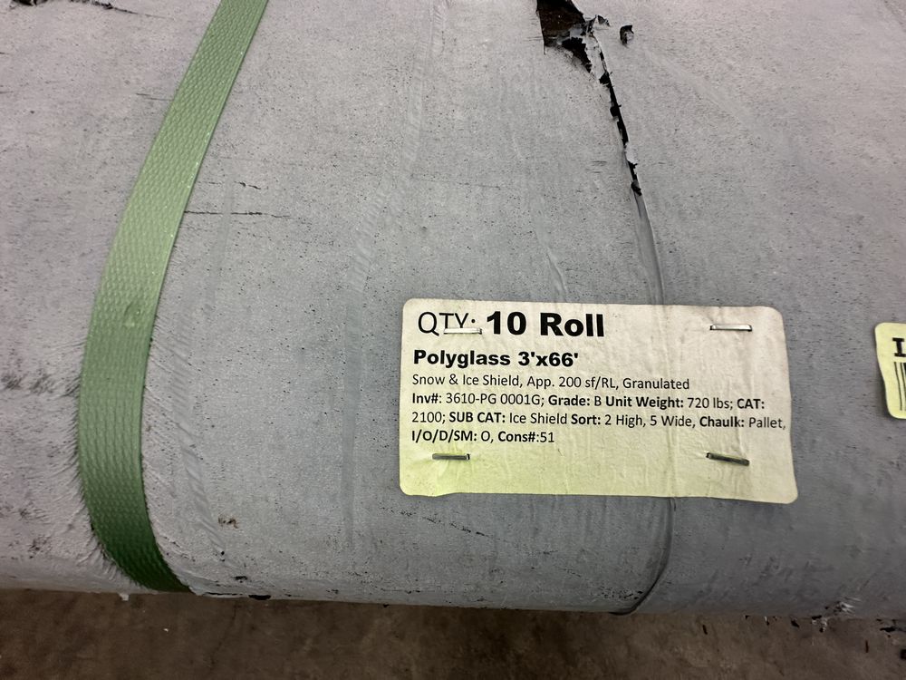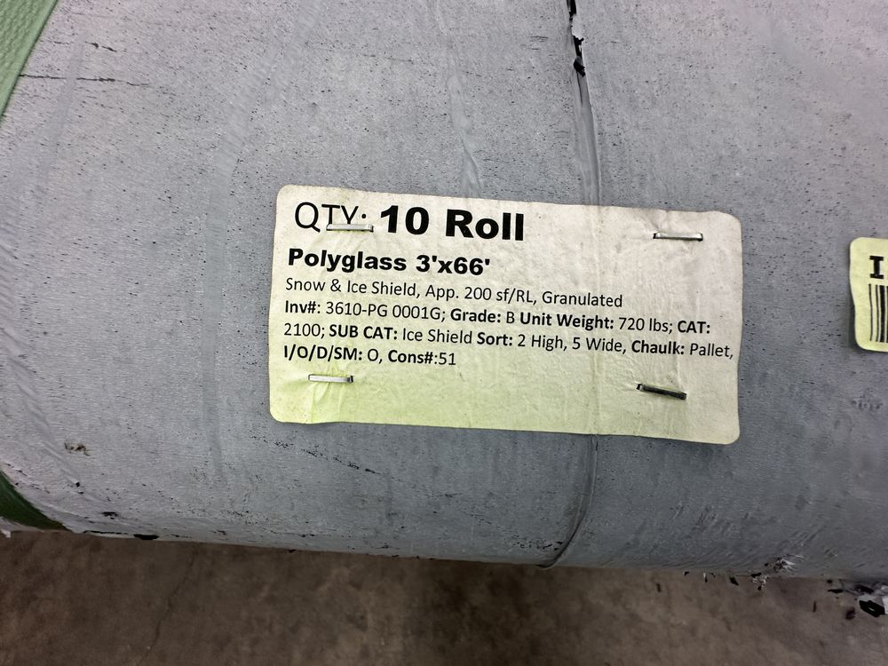 Polyglass 3'x66'. Snow & Ice Shield, Approximately 200 Square Feet per Roll, Rubber Membrane, Grade: B,This is a liquidated product. The Auction Company makes no express or implied representations or warranties of any kind regarding the Product. Any pre-existing retail, wholesale or manufacturer warranties will not transfer with the sale of this Product unless expressly stated otherwise on this page. The Buyer accepts the Product in as-is condition, with all faults. Weight: 710. Sold by: Roll. Sold as: Quantity X Price. Inventory #: 3610-PG 0001G