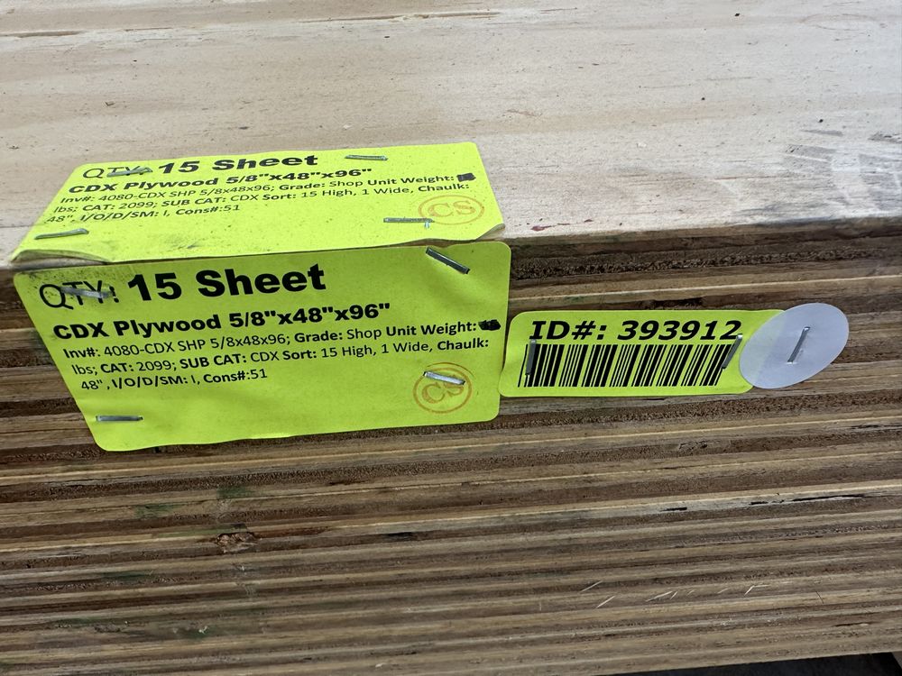 CDX Plywood 5/8"x48"x96". Grade: Shop,This is a liquidated product. The Auction Company makes no express or implied representations or warranties of any kind regarding the Product. Any pre-existing retail, wholesale or manufacturer warranties will not transfer with the sale of this Product unless expressly stated otherwise on this page. The Buyer accepts the Product in as-is condition, with all faults. Weight: x. Sold by: Sheet. Sold as: Quantity X Price. Inventory #: 4080-CDX SHP 5/8x48x96