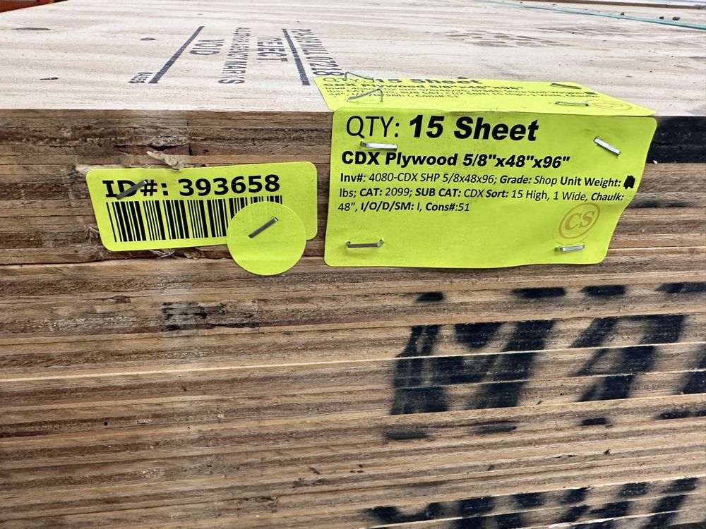 CDX Plywood 5/8"x48"x96". Grade: Shop,This is a liquidated product. The Auction Company makes no express or implied representations or warranties of any kind regarding the Product. Any pre-existing retail, wholesale or manufacturer warranties will not transfer with the sale of this Product unless expressly stated otherwise on this page. The Buyer accepts the Product in as-is condition, with all faults. Weight: x. Sold by: Sheet. Sold as: Quantity X Price. Inventory #: 4080-CDX SHP 5/8x48x96