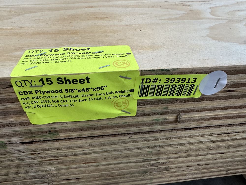 CDX Plywood 5/8"x48"x96" *See Description*. Grade: Shop *Fork Damage, Please See Photos*,This is a liquidated product. The Auction Company makes no express or implied representations or warranties of any kind regarding the Product. Any pre-existing retail, wholesale or manufacturer warranties will not transfer with the sale of this Product unless expressly stated otherwise on this page. The Buyer accepts the Product in as-is condition, with all faults. Weight: x. Sold by: Sheet. Sold as: Quantity X Price. Inventory #: 4080-CDX SHP 5/8x48x96
