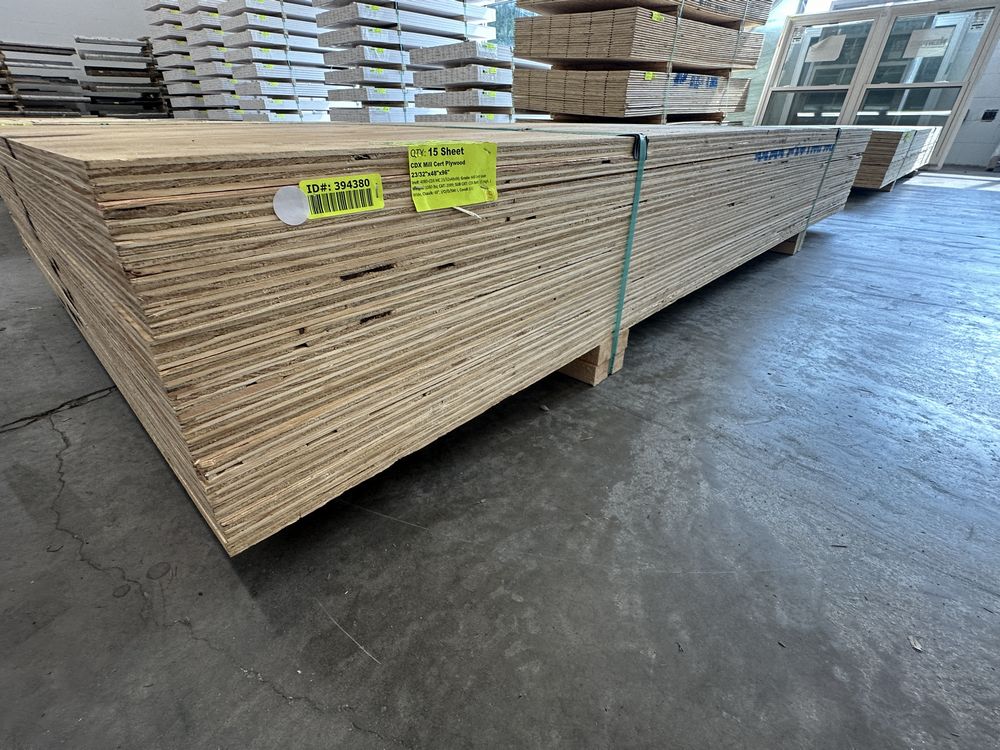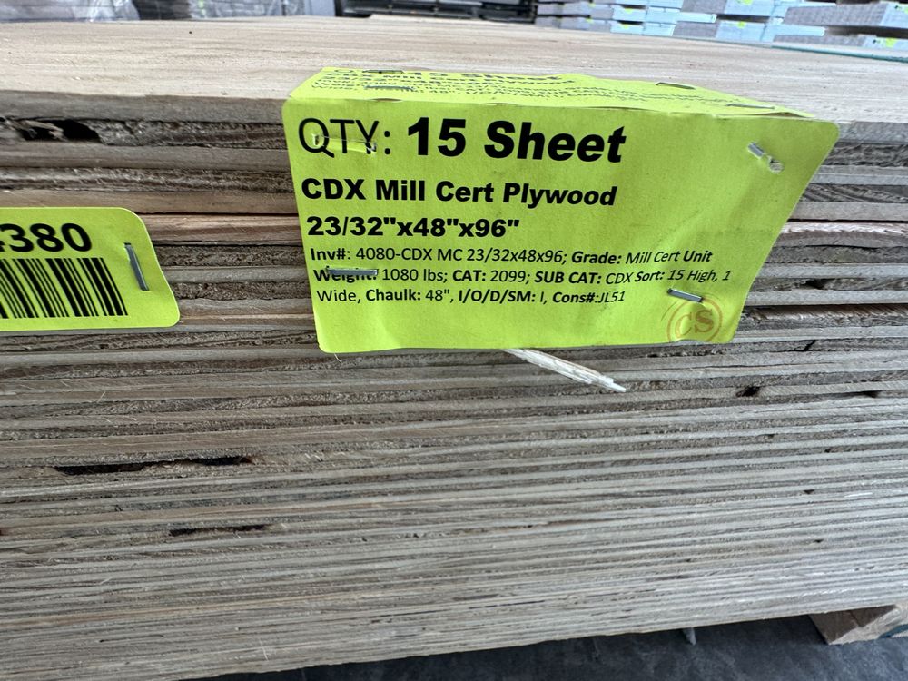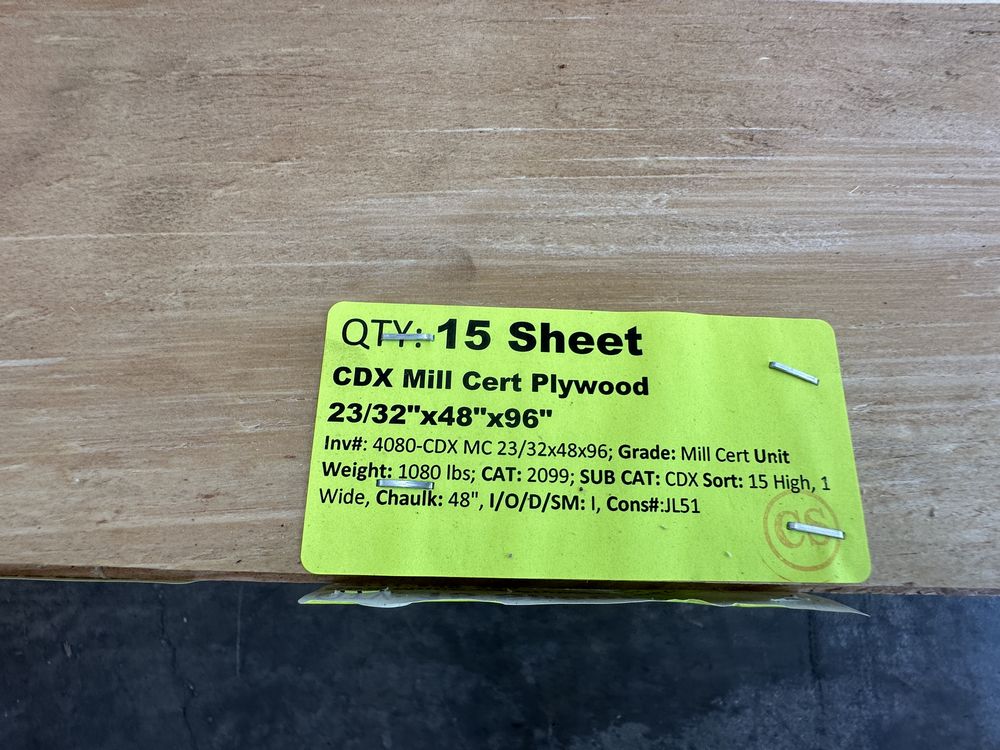 CDX Mill Cert Plywood 23/32"x48"x96". Grade: Mill Cert,This is a liquidated product. The Auction Company makes no express or implied representations or warranties of any kind regarding the Product. Any pre-existing retail, wholesale or manufacturer warranties will not transfer with the sale of this Product unless expressly stated otherwise on this page. The Buyer accepts the Product in as-is condition, with all faults. Weight: 1080. Sold by: Sheet. Sold as: Quantity X Price. Inventory #: 4080-CDX MC 23/32x48x96