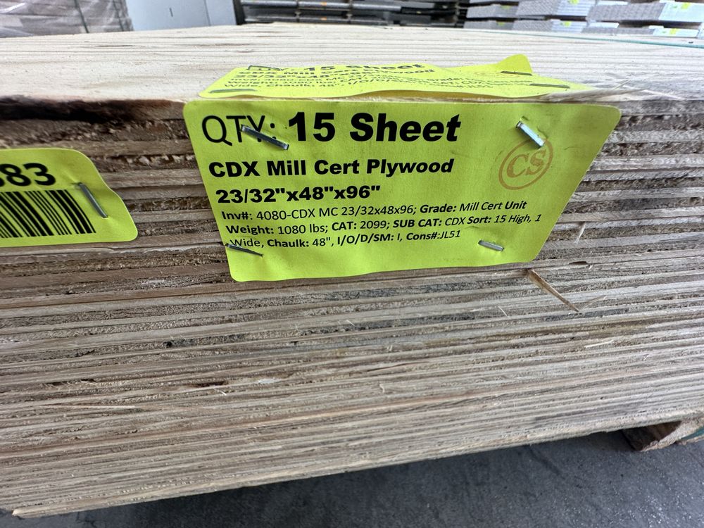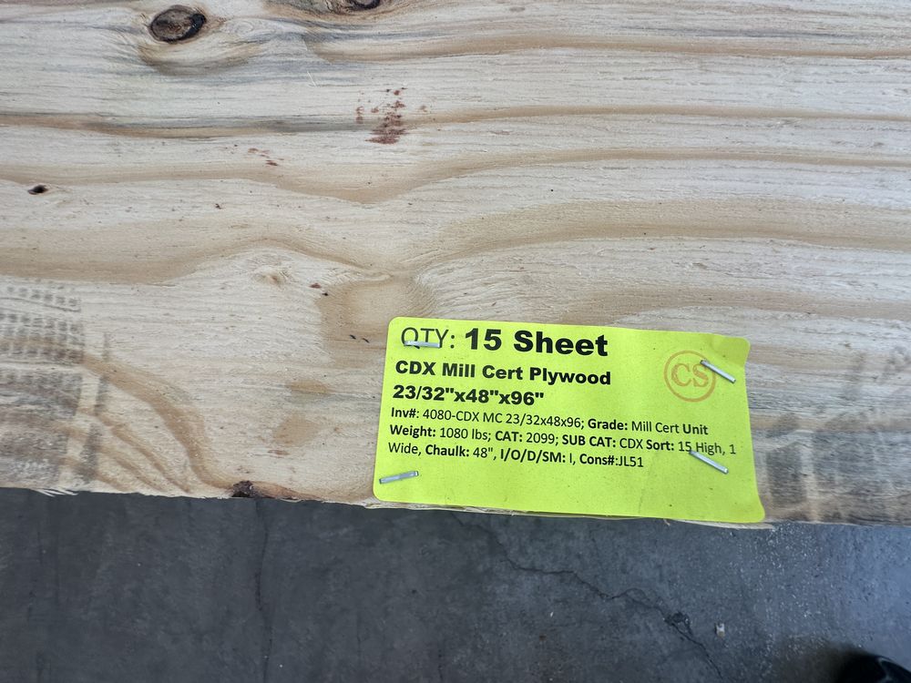 CDX Mill Cert Plywood 23/32"x48"x96". Grade: Mill Cert,This is a liquidated product. The Auction Company makes no express or implied representations or warranties of any kind regarding the Product. Any pre-existing retail, wholesale or manufacturer warranties will not transfer with the sale of this Product unless expressly stated otherwise on this page. The Buyer accepts the Product in as-is condition, with all faults. Weight: 1080. Sold by: Sheet. Sold as: Quantity X Price. Inventory #: 4080-CDX MC 23/32x48x96