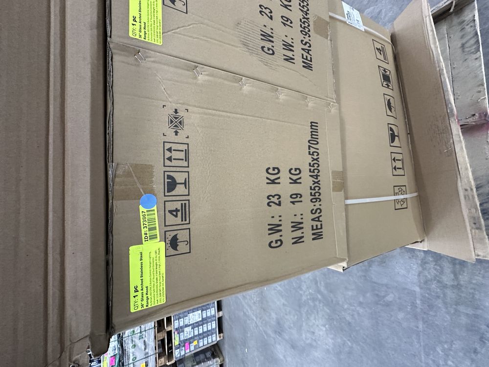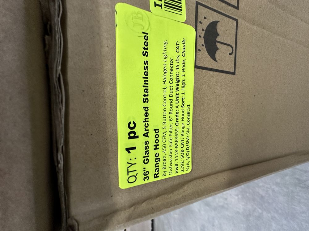36" Stainless Steel Arched Island Range Hood. By Broan, 450 CFM, 5 Push Button Control, Halogen Lighting, Dishwasher Safe Filter, 6" Round Duct Connector, Grade: A.,This is a liquidated product. Any pre-existing retail, wholesale or manufacturer warranties will not transfer with the sale of this Product unless expressly stated otherwise. Weight: 70 lbs.. Sold by: Piece. Sold as: Quantity X Price. Inventory #: 1118-B5636SS