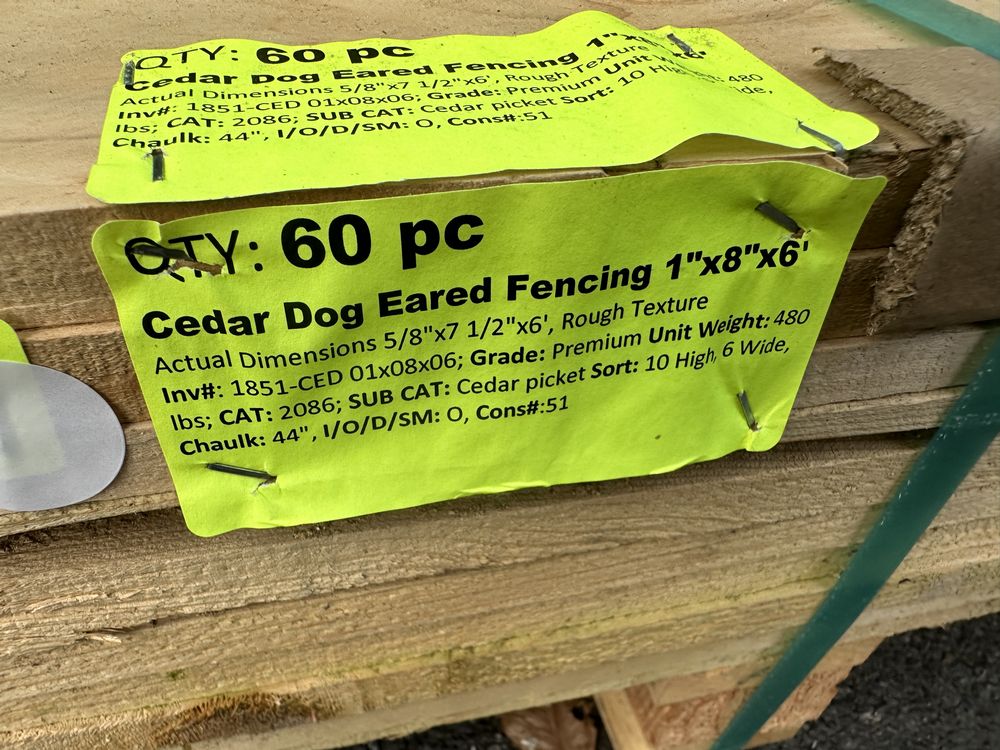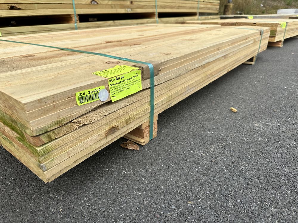 Cedar Dog Eared Fencing 1"x8"x6'. Actual Dimensions 5/8"x7 1/2"x6', Rough Texture Grade:Premium,This is a liquidated product. The Auction Company makes no express or implied representations or warranties of any kind regarding the Product. Any pre-existing retail, wholesale or manufacturer warranties will not transfer with the sale of this Product unless expressly stated otherwise on this page. The Buyer accepts the Product in as-is condition, with all faults. Weight: 480. Sold by: Piece. Sold as: Quantity X Price. Inventory #: 1851-CED 01x08x06