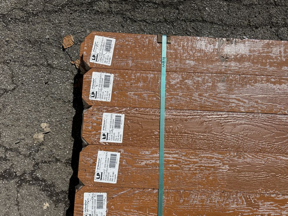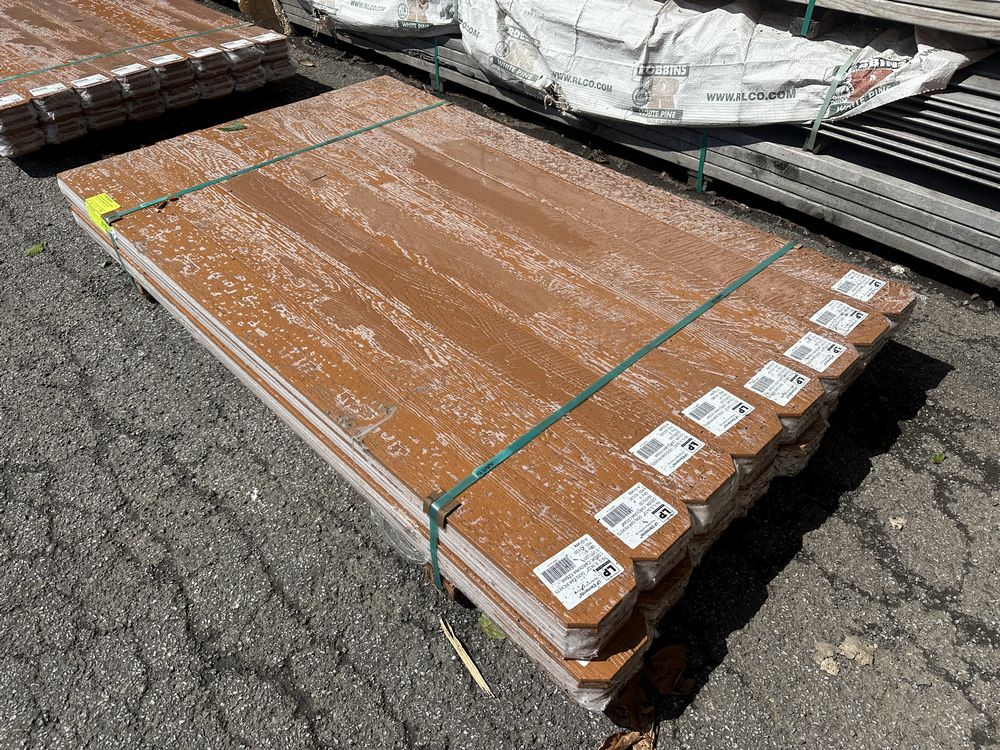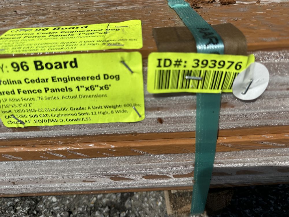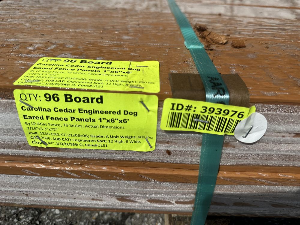 Carolina Cedar Engineered Dog Eared Fence Panels 1"x6"x6'. By LP Atlas Fence, 76 Series, Actual Dimensions 7/16"x5.3"x72" Grade: A,This is a liquidated product. The Auction Company makes no express or implied representations or warranties of any kind regarding the Product. Any pre-existing retail, wholesale or manufacturer warranties will not transfer with the sale of this Product unless expressly stated otherwise on this page. The Buyer accepts the Product in as-is condition, with all faults. Weight: 600. Sold by: Board. Sold as: Quantity X Price. Inventory #: 1850-ENG-CC 01x06x06