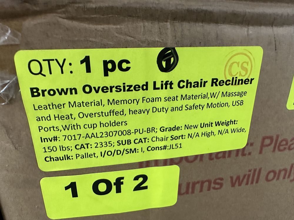 Brown Oversized Lift Chair Recliner. Leather Material, Memory Foam Seat Material W/ massage and Heat, Overstuffed, Heavy Duty and Safty Motion, USB Ports W/ Cup Holders, Grade: New Weight: . Sold by: . Sold as: Quantity X Price. Inventory #: 7017-AAL2307008-PU-BR