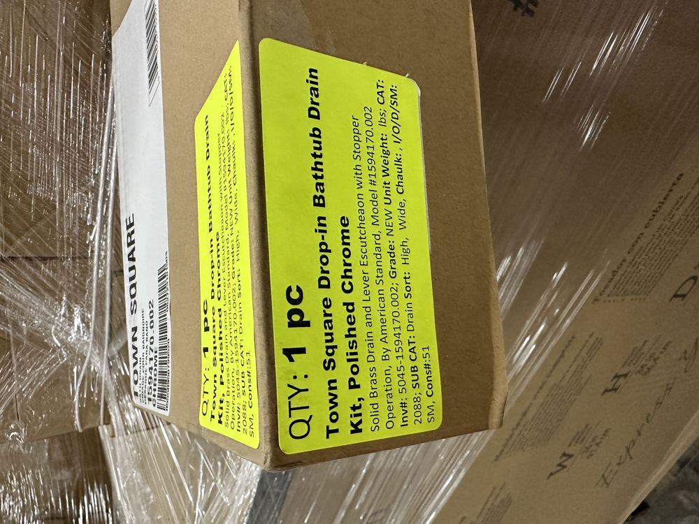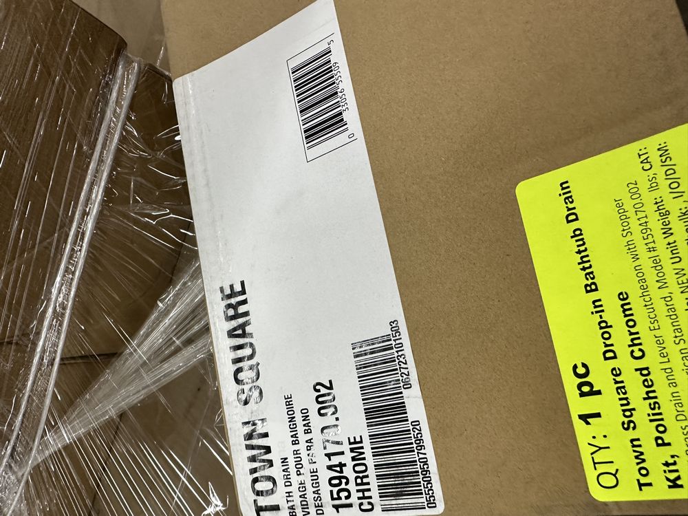 Town Square Drop-in Bathtub Drain Kit, Polished Chrome. Solid Brass Drain and Lever Escutcheon With Stopper Operation, By American Standard, Model #1594170.002 Grade: New,This is a liquidated product. No warranties are expressed or implied Weight: x. Sold by: Piece. Sold as: Quantity X Price. Inventory #: 5045-1594170.002