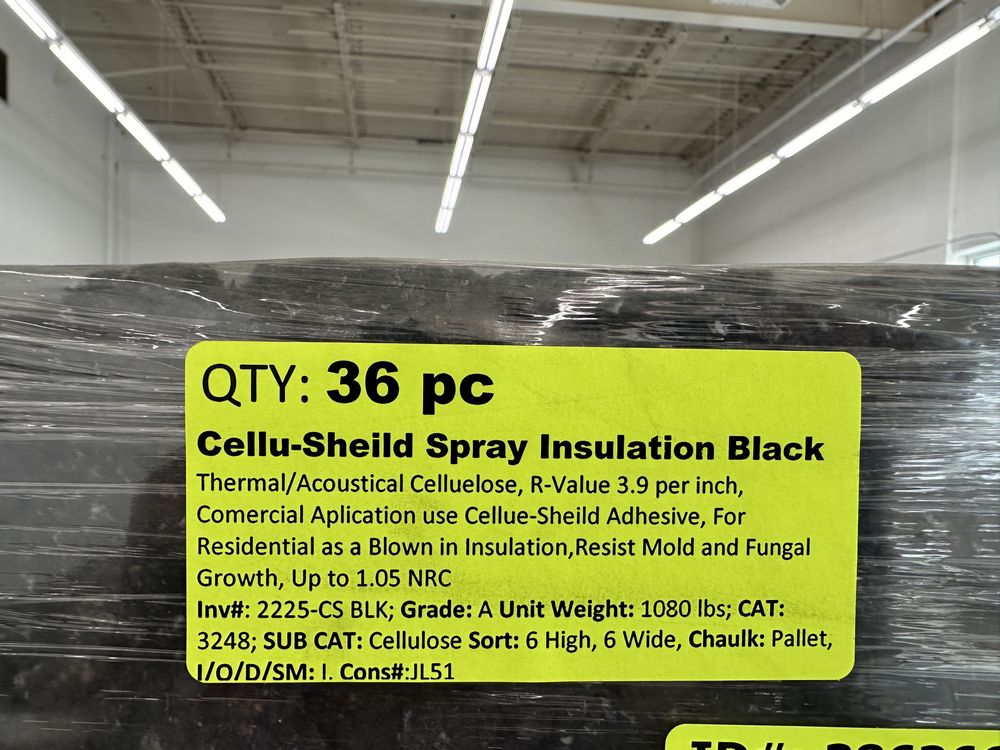 Black Cellu-Shield Spray Insulation. Thermal/Acoustical Cellulose, R-Value 3.9 Per Inch Commercial Application use Cellue-Sheild Adhesive, For Residential as a Blown In Insulation, Resist Mold and Fungal Growth, Up To 1.05 NRC Grade : A,This is a liquidated product. The Auction Company makes no express or implied representations or warranties of any kind regarding the Product. Any pre-existing retail, wholesale or manufacturer warranties will not transfer with the sale of this Product unless expressly stated otherwise on this page. The Buyer accepts the Product in as-is condition, with all faults. Weight: 1080. Sold by: Piece. Sold as: Quantity X Price. Inventory #: 2225-CS BLK