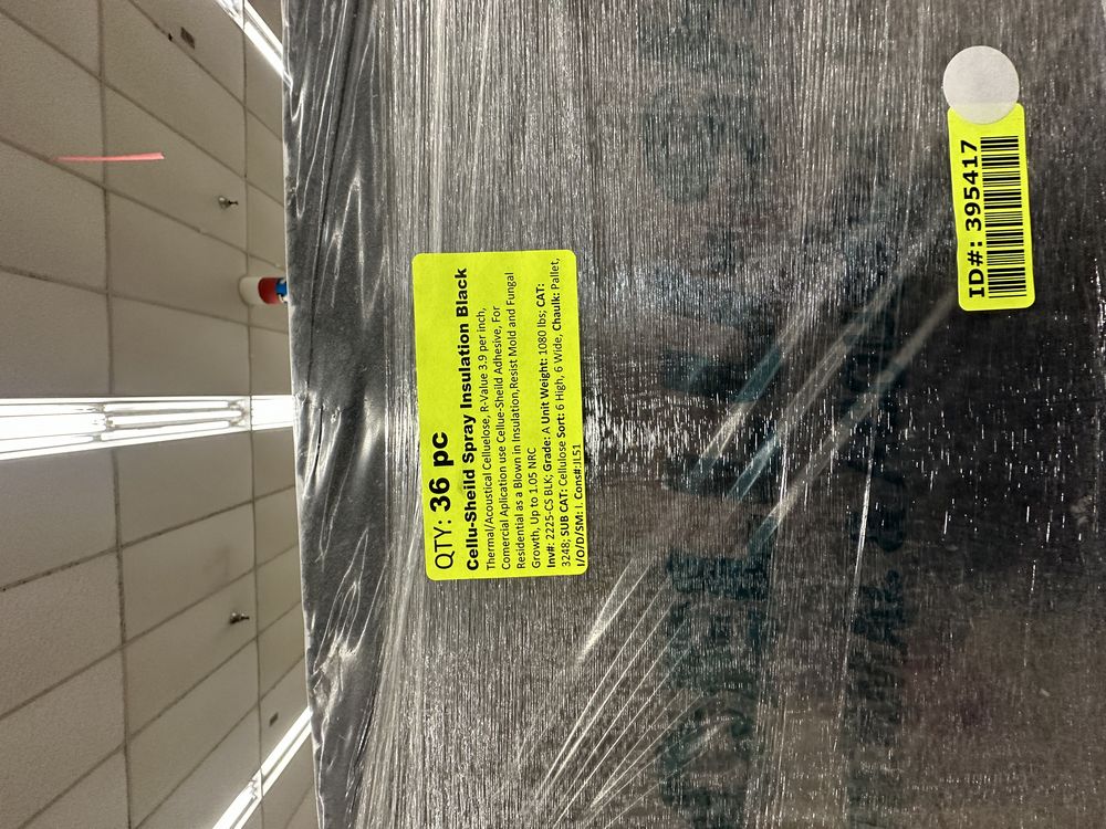 Black Cellu-Shield Spray Insulation *See Description*. Thermal/Acoustical Cellulose, R-Value 3.9 Per Inch Commercial Application use Cellue-Sheild Adhesive, For Residential as a Blown In Insulation, Resist Mold and Fungal Growth, Up To 1.05 NRC Grade : A *1 Piece suffered from fork damage, see photos*,This is a liquidated product. The Auction Company makes no express or implied representations or warranties of any kind regarding the Product. Any pre-existing retail, wholesale or manufacturer warranties will not transfer with the sale of this Product unless expressly stated otherwise on this page. The Buyer accepts the Product in as-is condition, with all faults. Weight: 1080. Sold by: Piece. Sold as: Quantity X Price. Inventory #: 2225-CS BLK