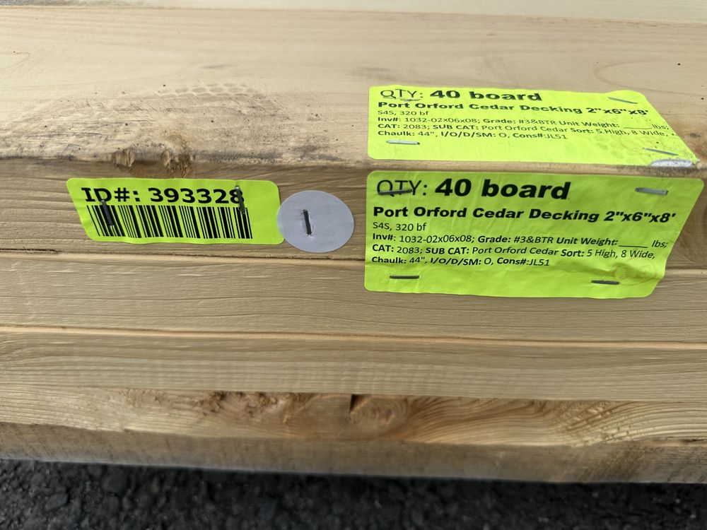 Port Orford Cedar Decking 2"x6"x8'. S4S, 320 Board Foot Grade: #3&BTR,This is a liquidated product. The Auction Company makes no express or implied representations or warranties of any kind regarding the Product. Any pre-existing retail, wholesale or manufacturer warranties will not transfer with the sale of this Product unless expressly stated otherwise on this page. The Buyer accepts the Product in as-is condition, with all faults. Weight: x. Sold by: Board. Sold as: Quantity X Price. Inventory #: 1032-02x06x08