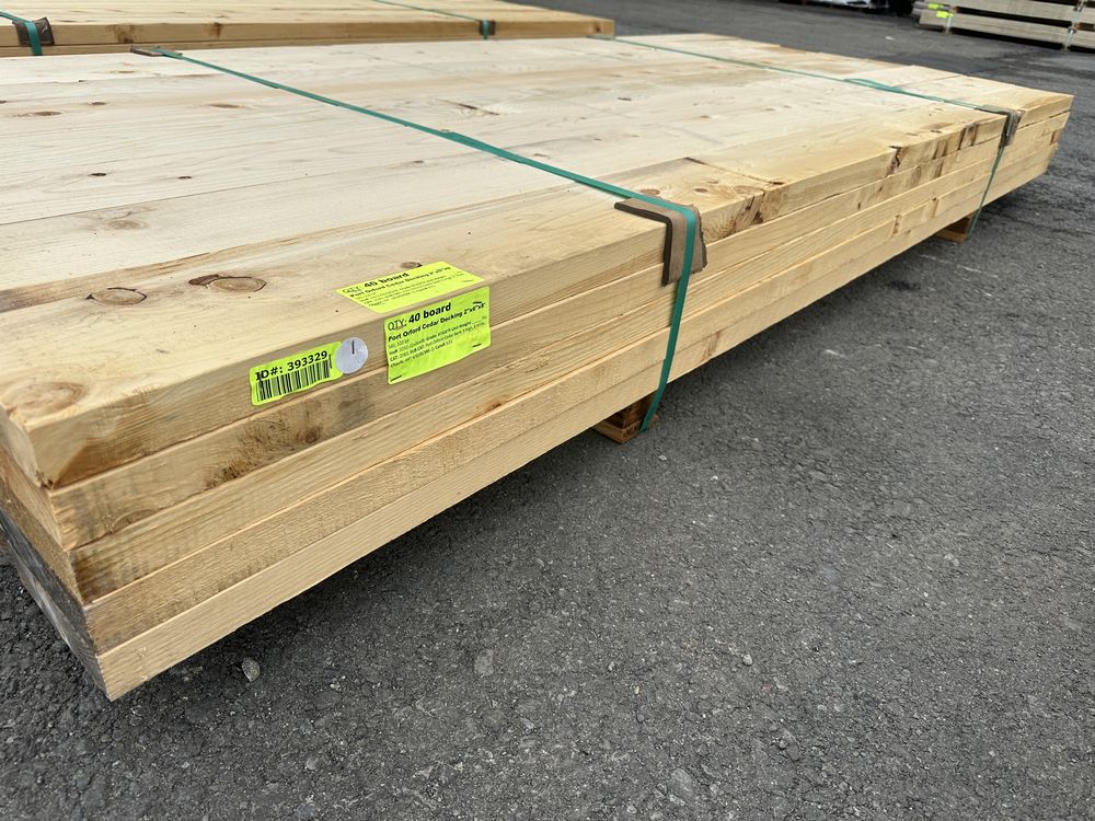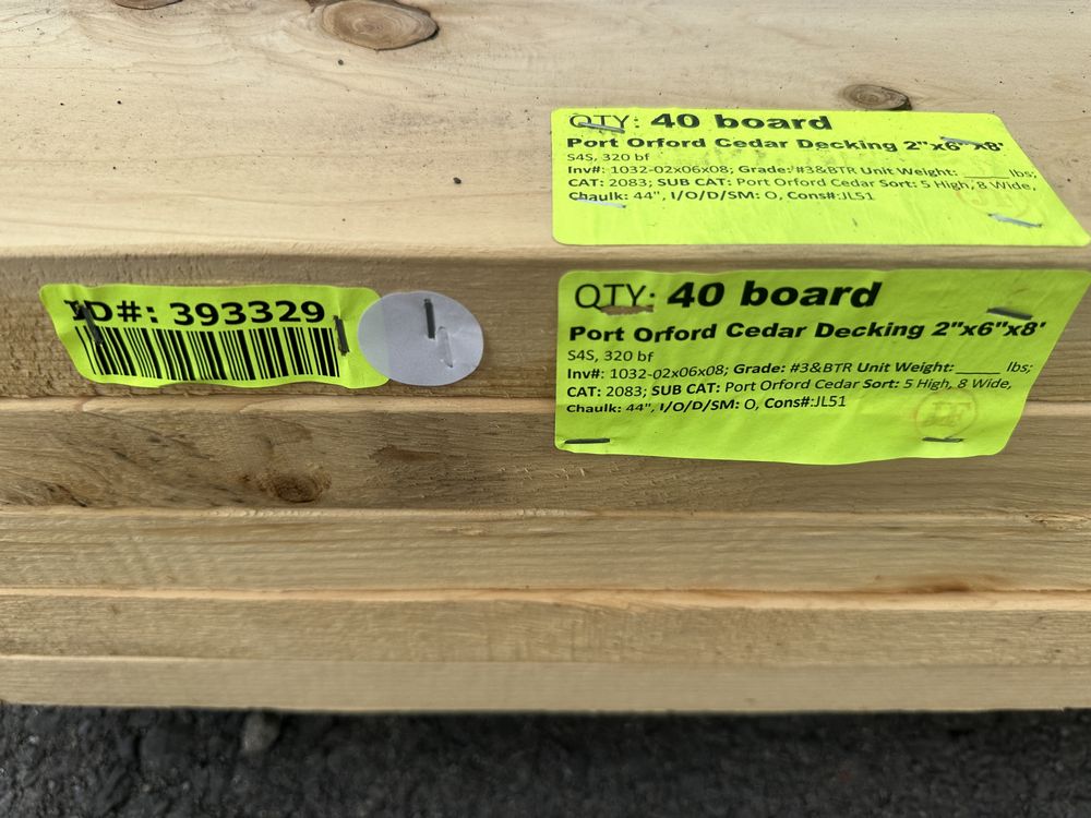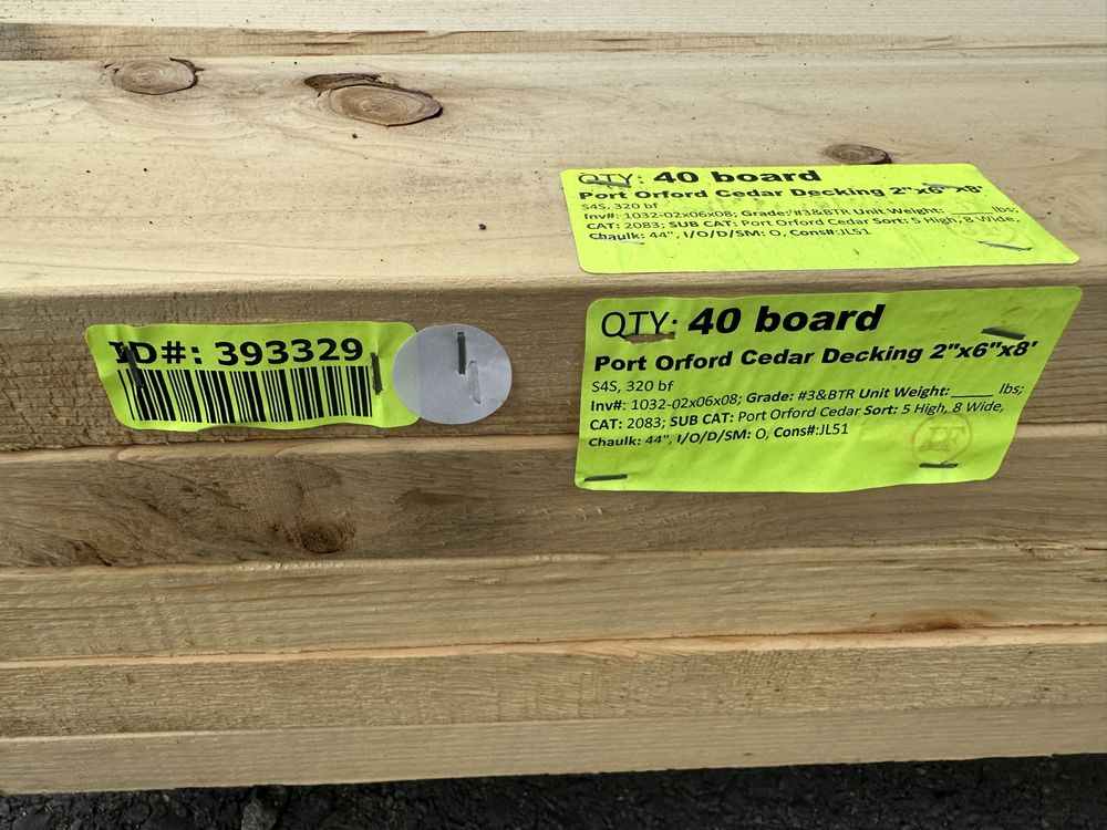 Port Orford Cedar Decking 2"x6"x8'. S4S, 320 Board Foot Grade: #3&BTR,This is a liquidated product. The Auction Company makes no express or implied representations or warranties of any kind regarding the Product. Any pre-existing retail, wholesale or manufacturer warranties will not transfer with the sale of this Product unless expressly stated otherwise on this page. The Buyer accepts the Product in as-is condition, with all faults. Weight: x. Sold by: Board. Sold as: Quantity X Price. Inventory #: 1032-02x06x08