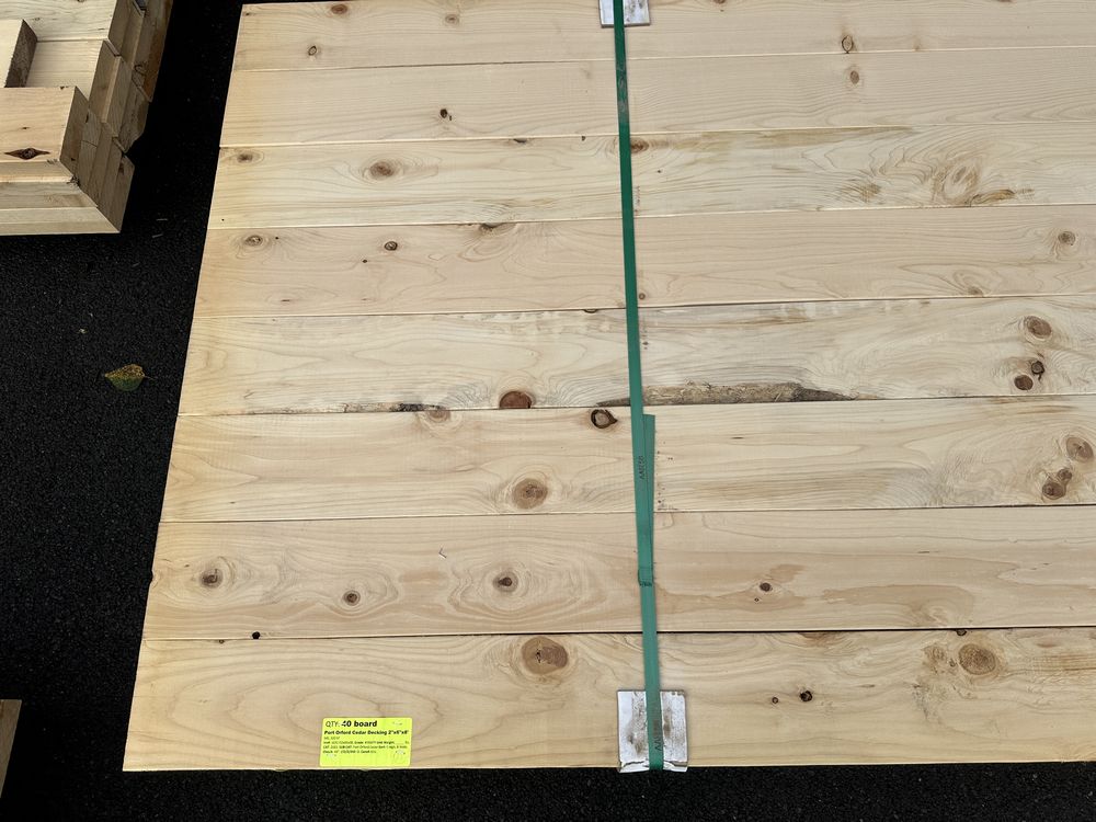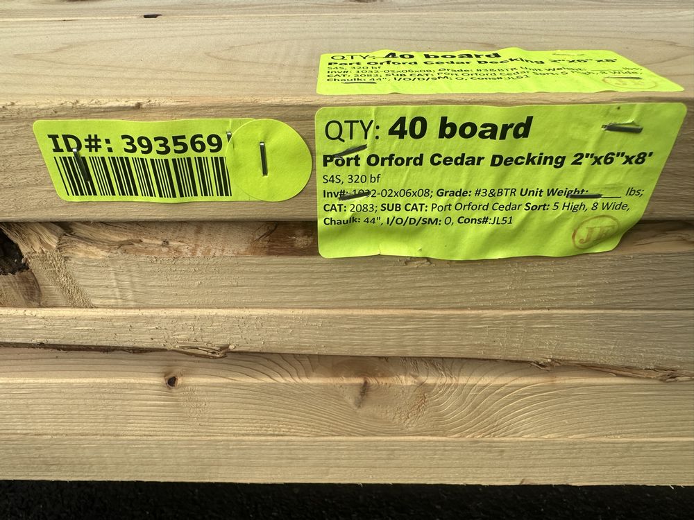 Port Orford Cedar Decking 2"x6"x8'. S4S, 320 Board Foot Grade: #3&BTR,This is a liquidated product. The Auction Company makes no express or implied representations or warranties of any kind regarding the Product. Any pre-existing retail, wholesale or manufacturer warranties will not transfer with the sale of this Product unless expressly stated otherwise on this page. The Buyer accepts the Product in as-is condition, with all faults. Weight: x. Sold by: Board. Sold as: Quantity X Price. Inventory #: 1032-02x06x08