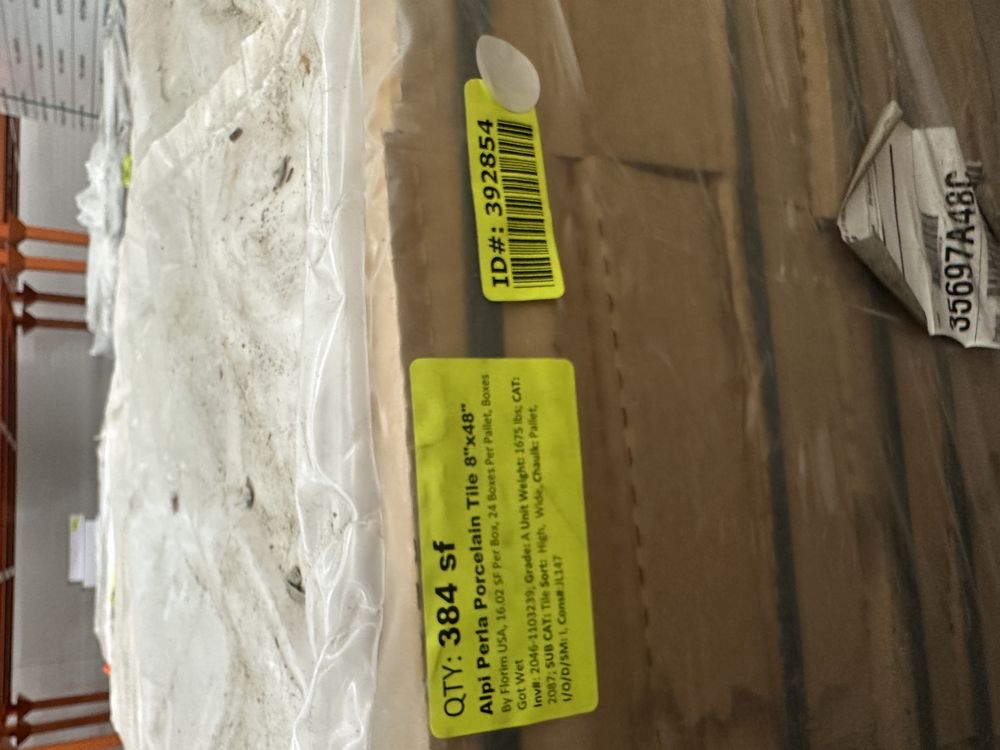 Alpi Perla Porcelain Tile 8"x48" *See Description*. By Florim USA, 16.02 Square Foot Per Box, 24 Boxes Per Pallet, Boxes Got Wet, Grade: A,This is a liquidated product. The Auction Company makes no express or implied representations or warranties of any kind regarding the Product. Any pre-existing retail, wholesale or manufacturer warranties will not transfer with the sale of this Product unless expressly stated otherwise on this page. The Buyer accepts the Product in as-is condition, with all faults. Weight: 1675. Sold by: Square Foot . Sold as: Quantity X Price. Inventory #: 2046-1103239