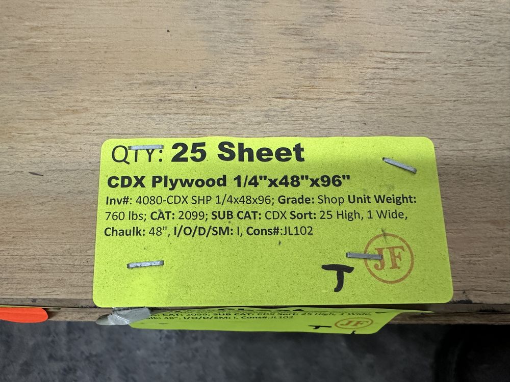 CDX Plywood 1/4"x48"x96". Grade: Shop,This is a liquidated product. The Auction Company makes no express or implied representations or warranties of any kind regarding the Product. Any pre-existing retail, wholesale or manufacturer warranties will not transfer with the sale of this Product unless expressly stated otherwise on this page. The Buyer accepts the Product in as-is condition, with all faults. Weight: 760. Sold by: Sheet. Sold as: Quantity X Price. Inventory #: 4080-CDX SHP 1/4x48x96