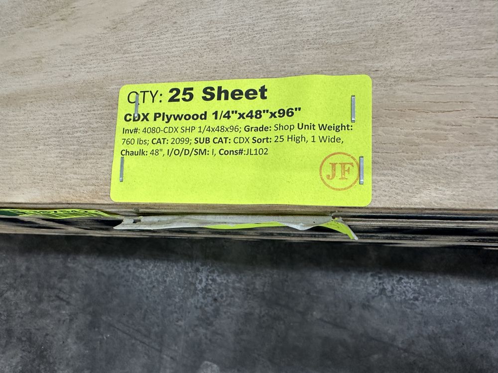 CDX Plywood 1/4"x48"x96". Grade: Shop,This is a liquidated product. The Auction Company makes no express or implied representations or warranties of any kind regarding the Product. Any pre-existing retail, wholesale or manufacturer warranties will not transfer with the sale of this Product unless expressly stated otherwise on this page. The Buyer accepts the Product in as-is condition, with all faults. Weight: 760. Sold by: Sheet. Sold as: Quantity X Price. Inventory #: 4080-CDX SHP 1/4x48x96
