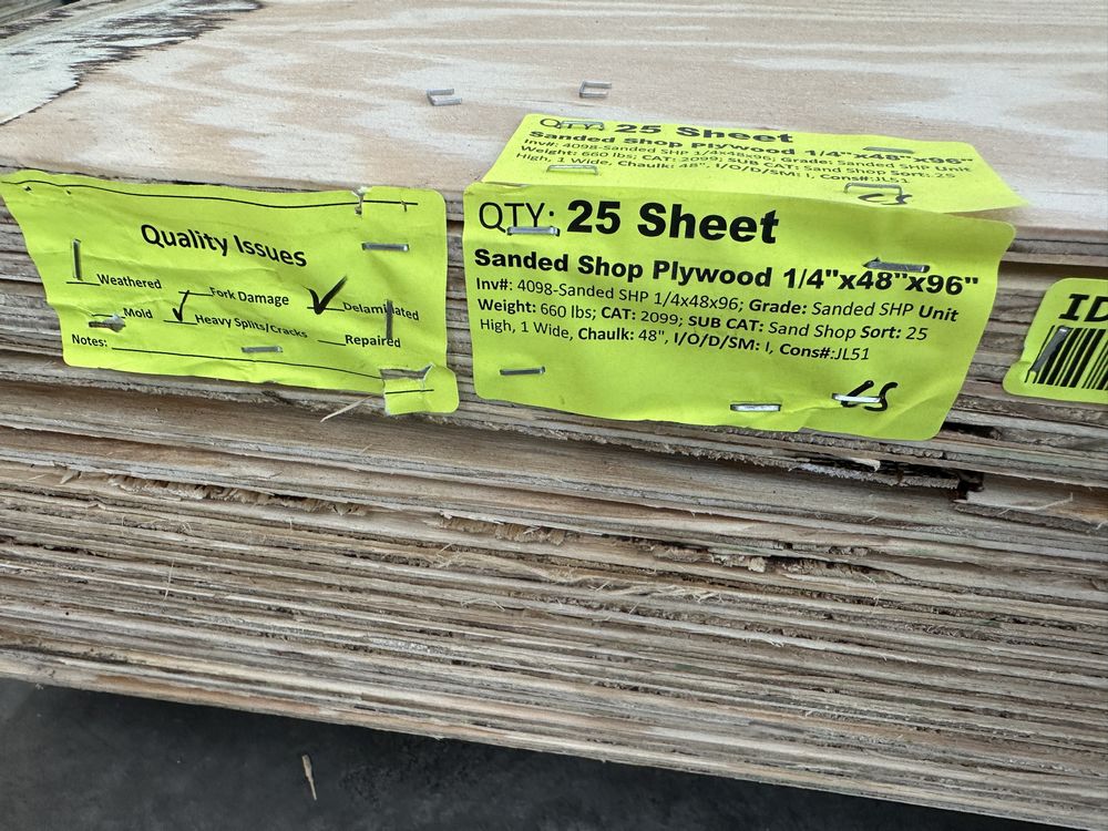 Sanded Shop Plywood 1/4"x48"x96". Grade: Sanded Shop Plywood **Heavy Splits/Cracks and Delaminated**,This is a liquidated product. The Auction Company makes no express or implied representations or warranties of any kind regarding the Product. Any pre-existing retail, wholesale or manufacturer warranties will not transfer with the sale of this Product unless expressly stated otherwise on this page. The Buyer accepts the Product in as-is condition, with all faults. Weight: 660. Sold by: Sheet. Sold as: Quantity X Price. Inventory #: 4098-Sanded SHP 1/4x48x96