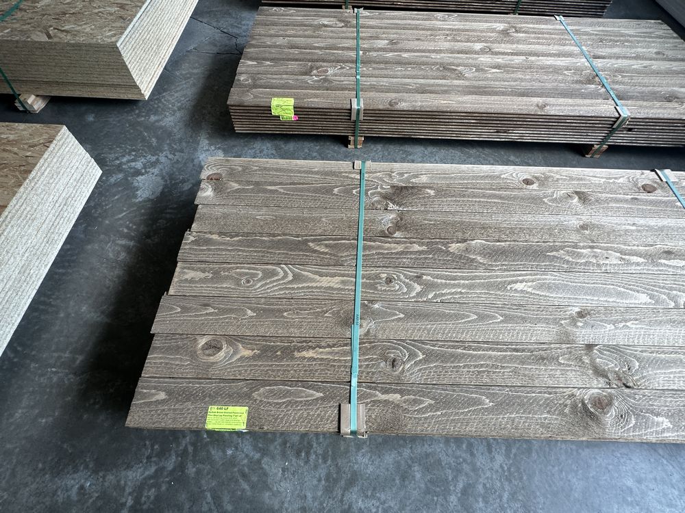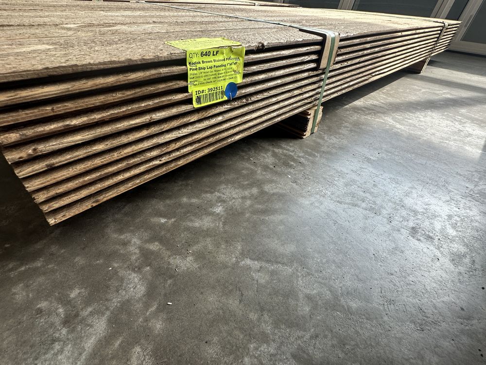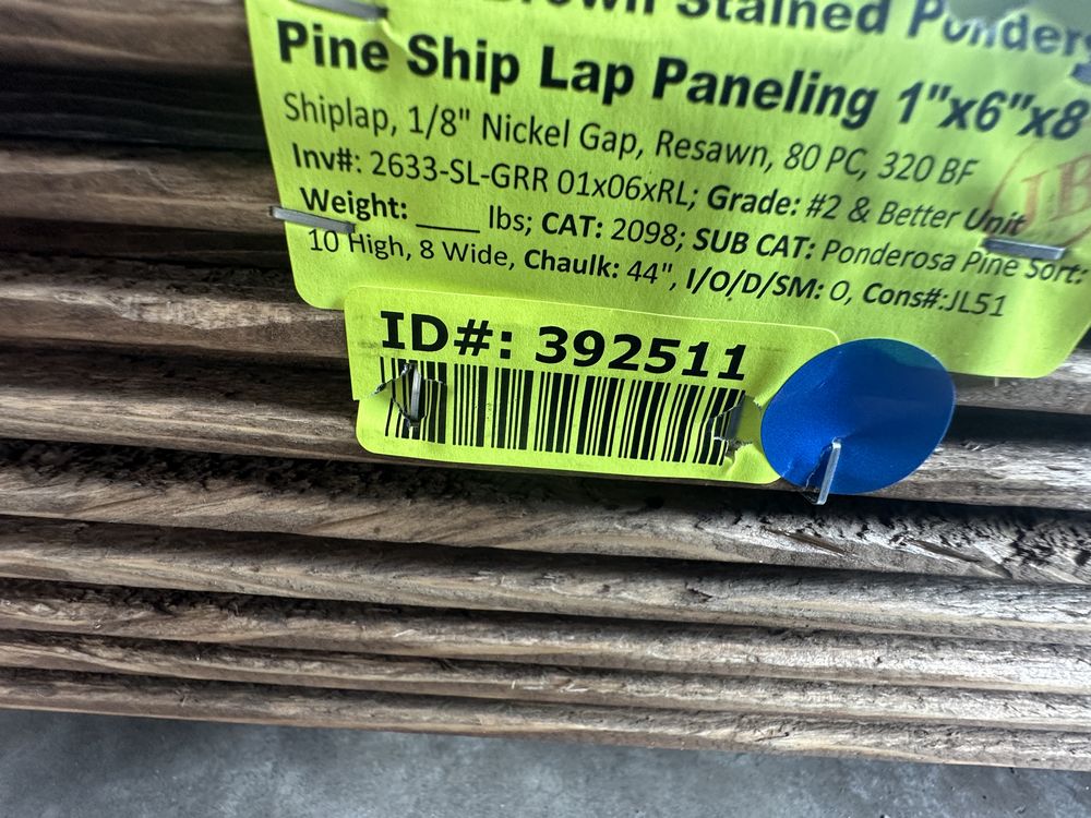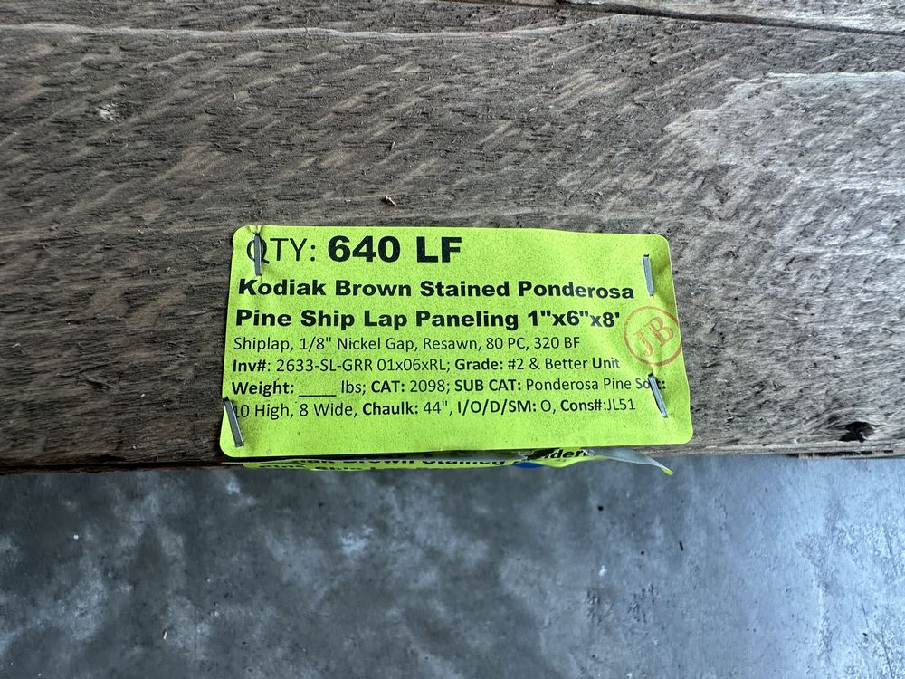 Kodiak Brown Stained Ponderosa Pine Shiplap Paneling 1"x6"x8'. Shiplap, 1/8" Nickel Gap, Resawn, 80 pieces, 320 board feet, Grade: #2 & Better.,This is a liquidated product. The Auction Company makes no express or implied representations or warranties of any kind regarding the Product. Any pre-existing retail, wholesale or manufacturer warranties will not transfer with the sale of this Product unless expressly stated otherwise on this page. The Buyer accepts the Product in as-is condition, with all faults. Weight: X. Sold by: Linear Foot. Sold as: Quantity X Price. Inventory #: 2633-SL-GRR 01x06xRL