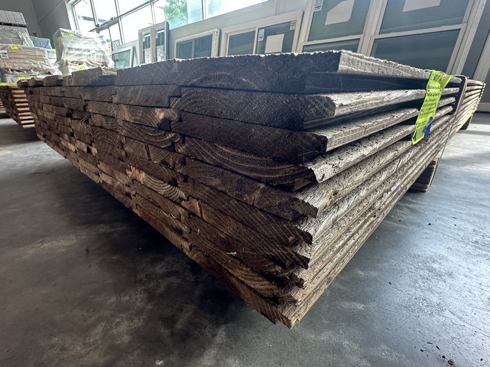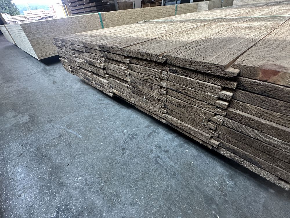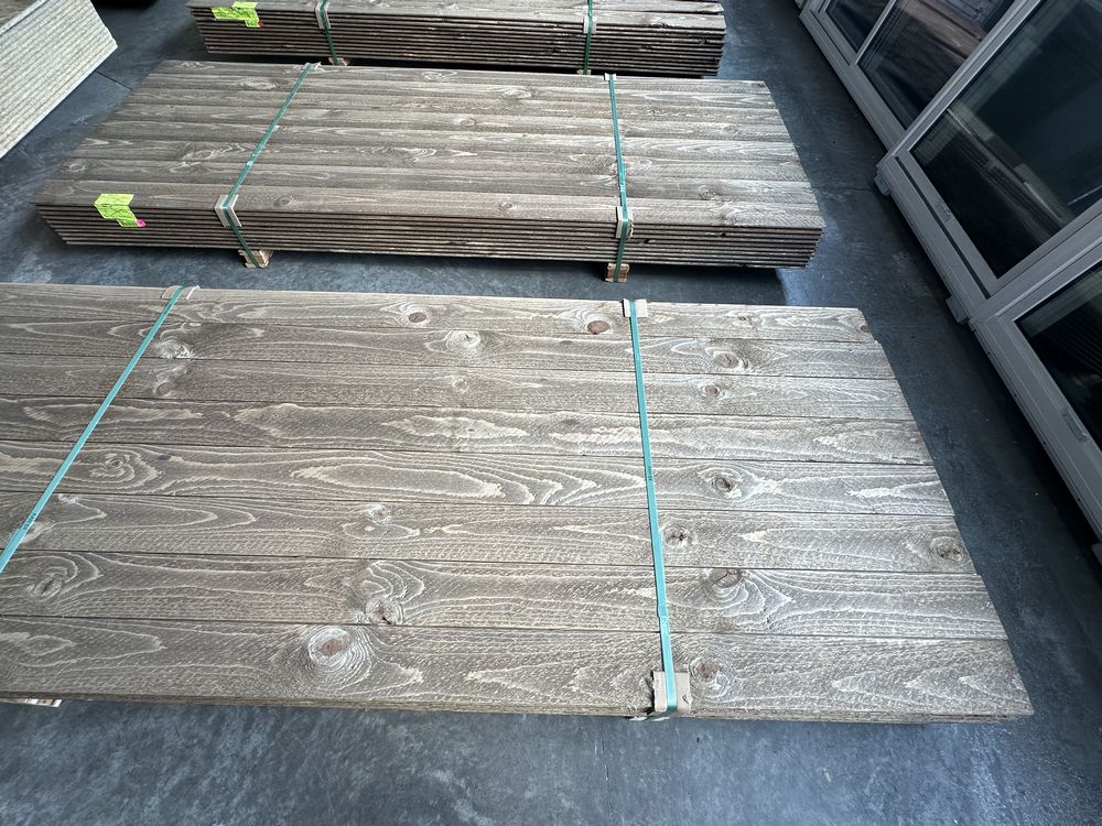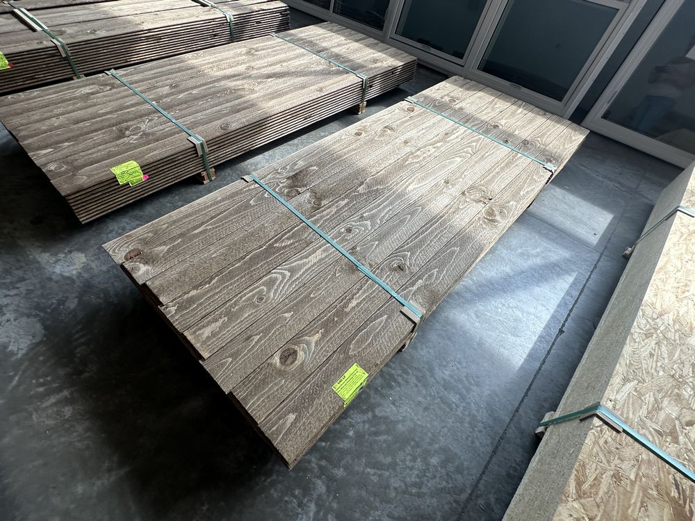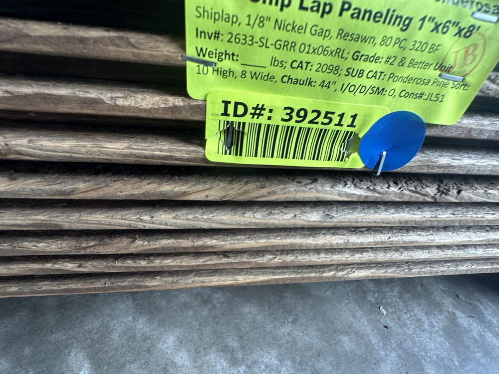 Kodiak Brown Stained Ponderosa Pine Shiplap Paneling 1"x6"x8'. Shiplap, 1/8" Nickel Gap, Resawn, 80 pieces, 320 board feet, Grade: #2 & Better.,This is a liquidated product. The Auction Company makes no express or implied representations or warranties of any kind regarding the Product. Any pre-existing retail, wholesale or manufacturer warranties will not transfer with the sale of this Product unless expressly stated otherwise on this page. The Buyer accepts the Product in as-is condition, with all faults. Weight: X. Sold by: Linear Foot. Sold as: Quantity X Price. Inventory #: 2633-SL-GRR 01x06xRL