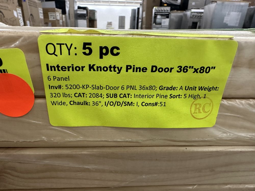 Interior Knotty Pine Door Pack 36"x80". 6 Panel Grade: A,This is a liquidated product. The Auction Company makes no express or implied representations or warranties of any kind regarding the Product. Any pre-existing retail, wholesale or manufacturer warranties will not transfer with the sale of this Product unless expressly stated otherwise on this page. The Buyer accepts the Product in as-is condition, with all faults. Weight: 320. Sold by: Piece. Sold as: Quantity X Price. Inventory #: 5200-KP-Slab-Door 6 PNL 36x80
