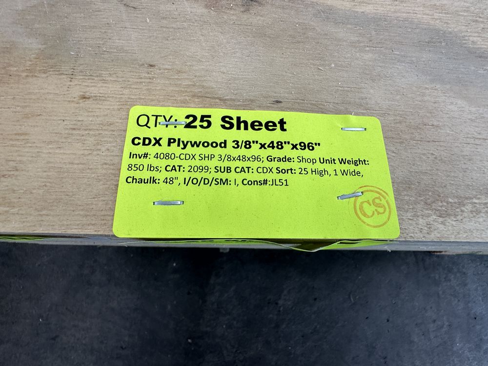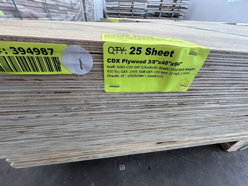 CDX Plywood 3/8"x48"x96". Grade: Shop,This is a liquidated product. The Auction Company makes no express or implied representations or warranties of any kind regarding the Product. Any pre-existing retail, wholesale or manufacturer warranties will not transfer with the sale of this Product unless expressly stated otherwise on this page. The Buyer accepts the Product in as-is condition, with all faults. Weight: 850. Sold by: Sheet. Sold as: Quantity X Price. Inventory #: 4080-CDX SHP 3/8x48x96