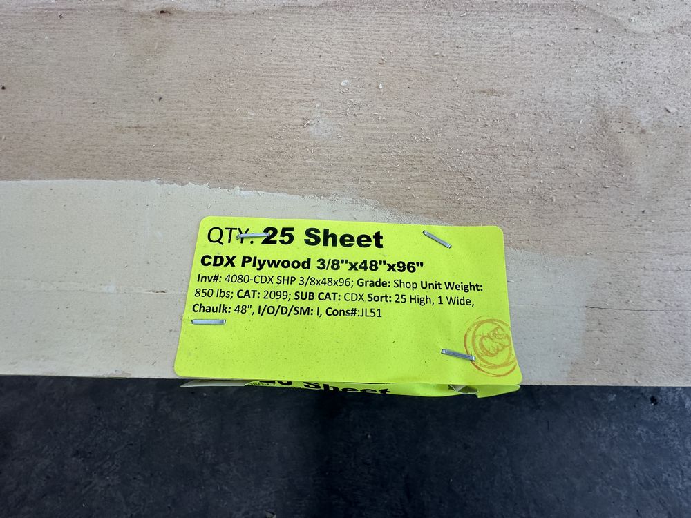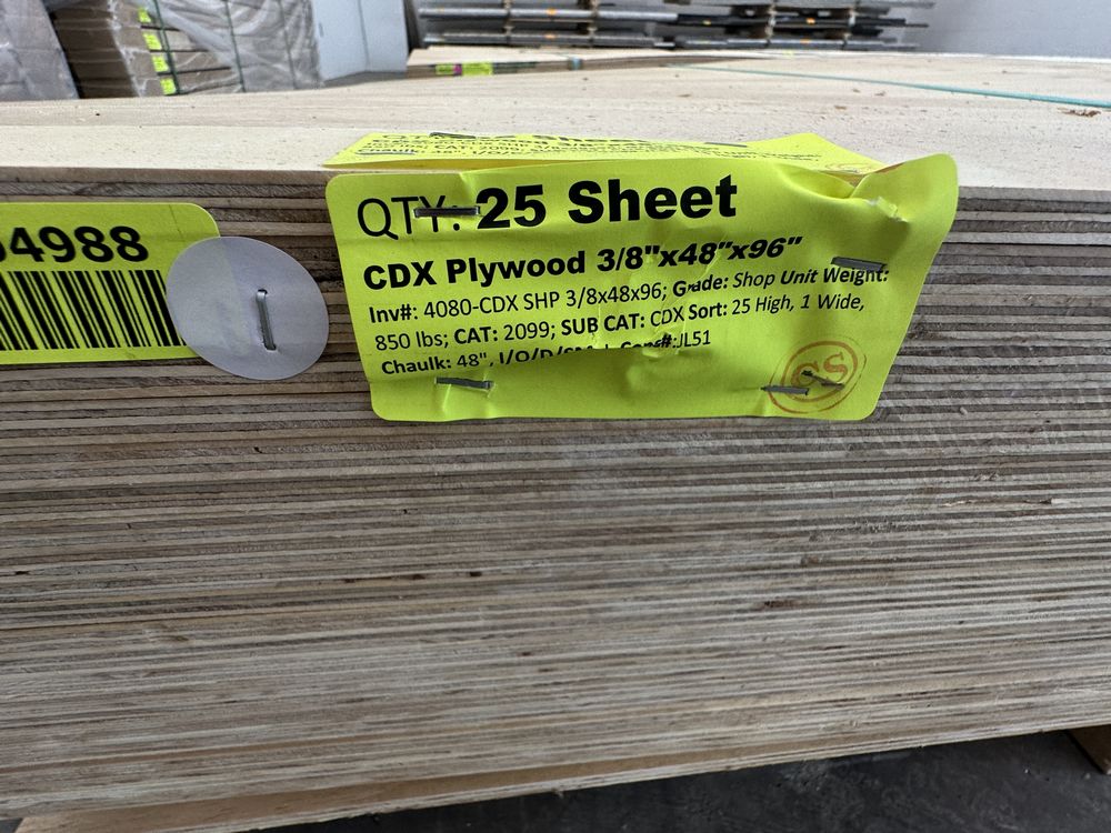 CDX Plywood 3/8"x48"x96". Grade: Shop,This is a liquidated product. The Auction Company makes no express or implied representations or warranties of any kind regarding the Product. Any pre-existing retail, wholesale or manufacturer warranties will not transfer with the sale of this Product unless expressly stated otherwise on this page. The Buyer accepts the Product in as-is condition, with all faults. Weight: 850. Sold by: Sheet. Sold as: Quantity X Price. Inventory #: 4080-CDX SHP 3/8x48x96