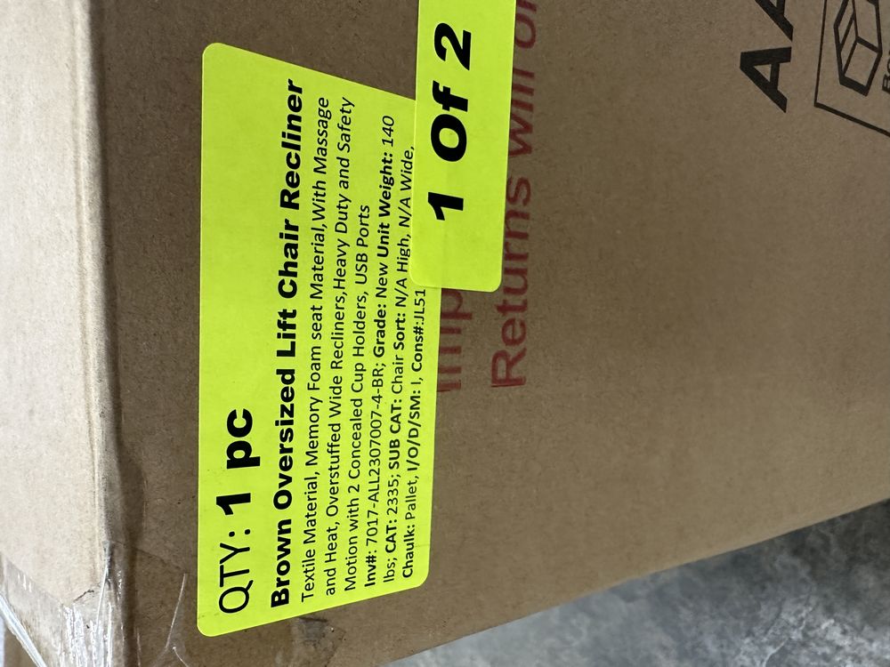 Brown Oversized Lift Chair Recliner. Textile Material, Memory Foam Seat Material, With Massage and Heat, Overstuffed Wide Recliners, Heavy Duty and Safety Motion with 2 Concealed Cup Holders, USB Ports. Grade: New Weight: . Sold by: . Sold as: Quantity X Price. Inventory #: 7017-ALL2307007-4-BR