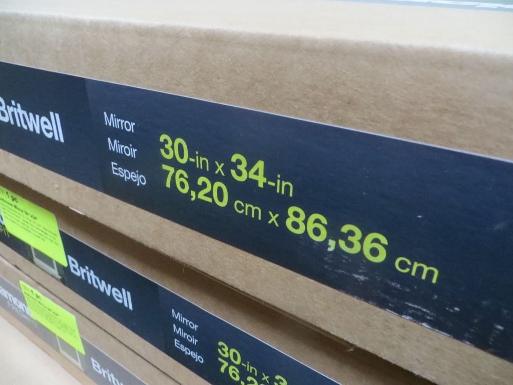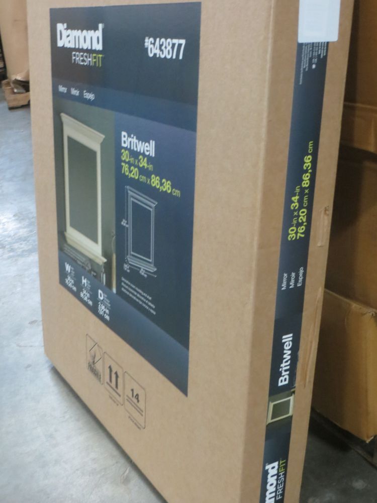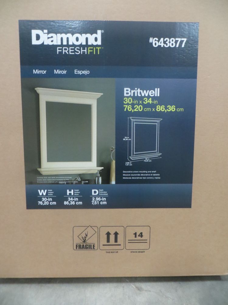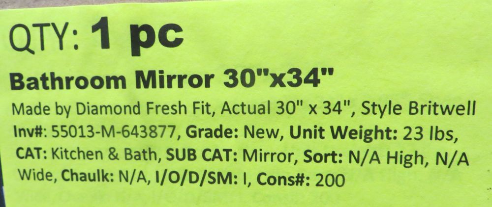 Bathroom Mirror 30"x34". Made by Diamond Fresh Fit, Actual Dimensions 30"x34", Style: Britwell, Grade: New.,This is a liquidated product. Any pre-existing retail, wholesale or manufacturer warranties will not transfer with the sale of this Product unless expressly stated otherwise. Weight: 25. Sold by: Piece. Sold as: Quantity X Price. Inventory #: 55013-M-643877