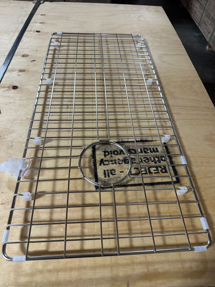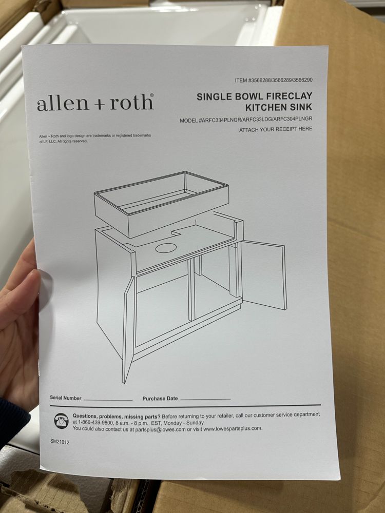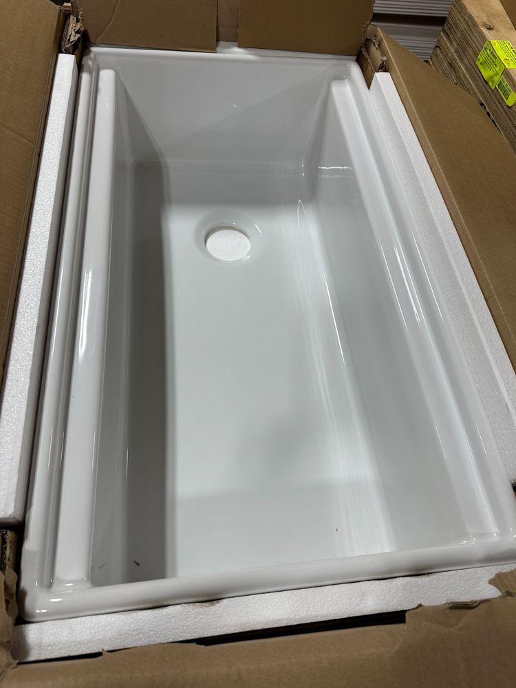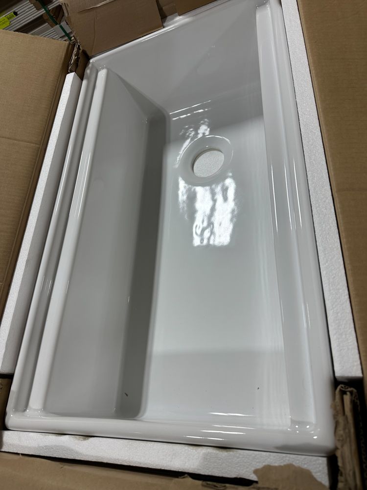 White Single Bowl Fireclay Farmhouse Sink 33"x18"x10". By Allen & Roth, 9" Bowl Depth, Scratch Resistant, Smooth Glazed Finish, Grid Set Included, Grade: New This is a liquidated product. Any pre-existing retail, wholesale or manufacturer warranties will not transfer with the sale of this Product unless expressly stated otherwise. Weight: 110 lbs. Sold by: Piece. Sold as: Quantity X Price. Inventory #: 5056-3566288